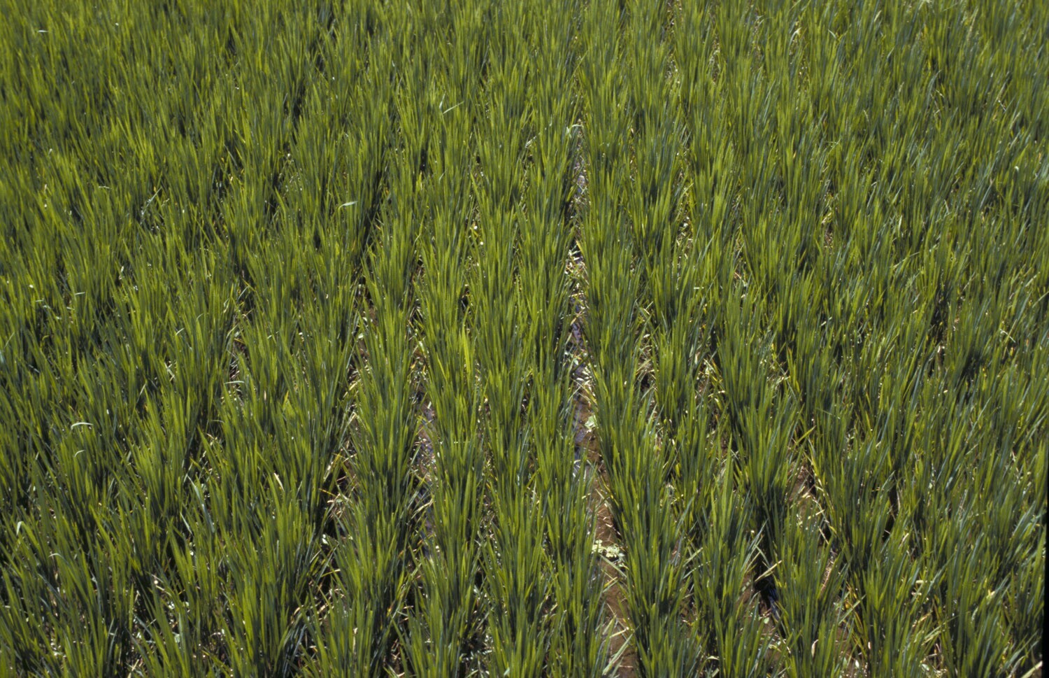 Rijstsawahs met jonge plantjes, gescheiden door irri...