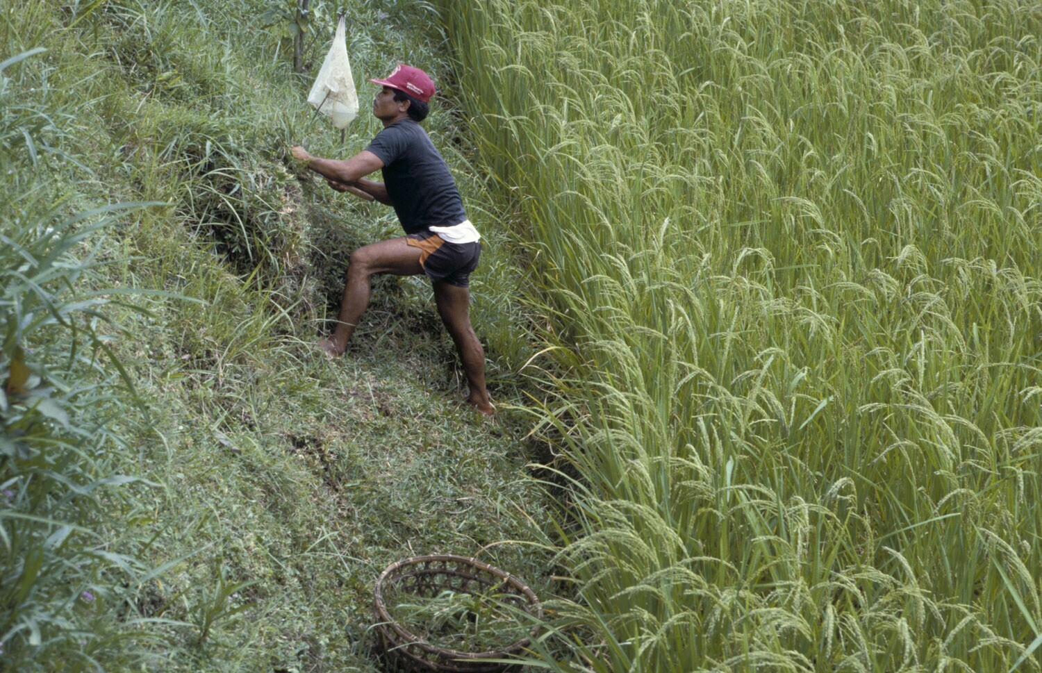 Man snijd onkruid van een talud, Bali.