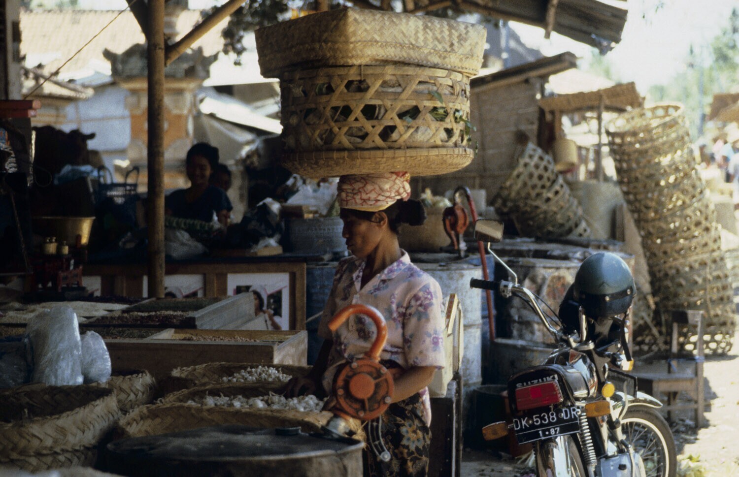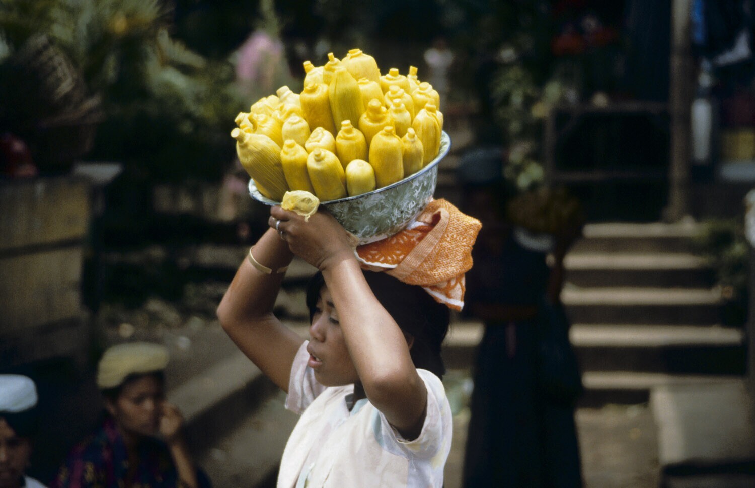 Vrouw met koopwaar op haar hoofd. Bali.
