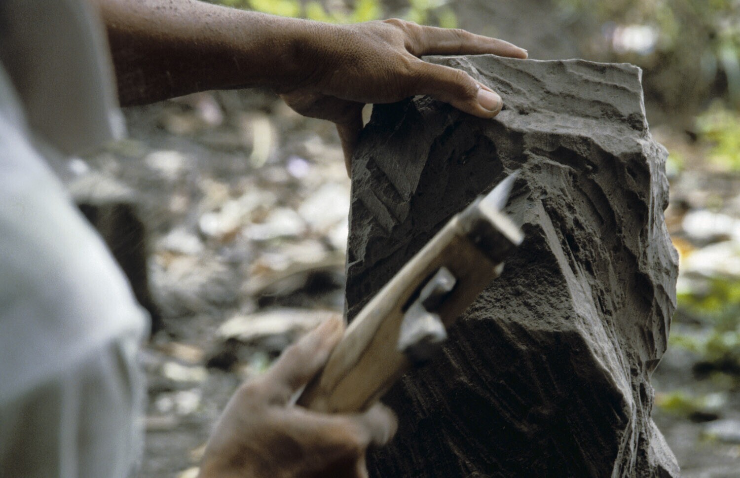 De hamer van de steenhouwer op de te bewerken steen....