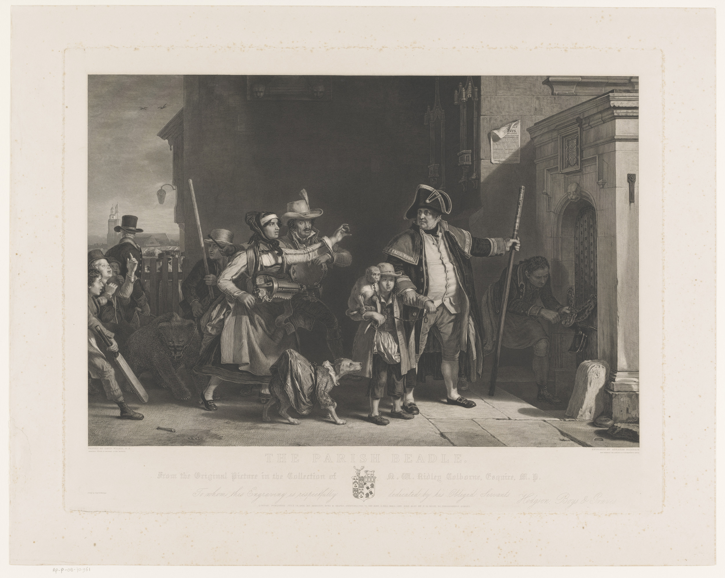 Kerkbaljuw houdt een jongen met aap bij de arm