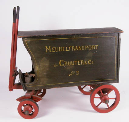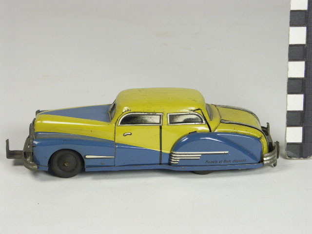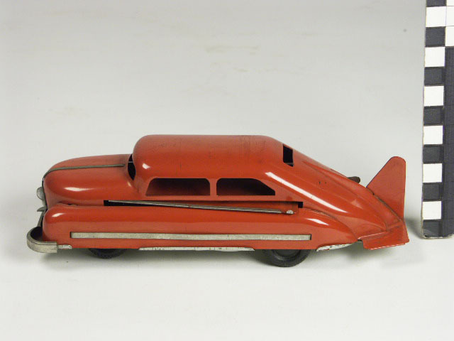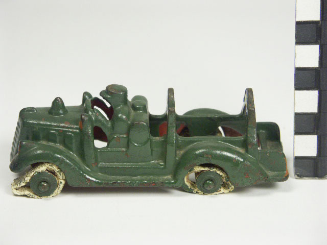 Blikken brandweerwagen met bandweermannen, gedrukt o...