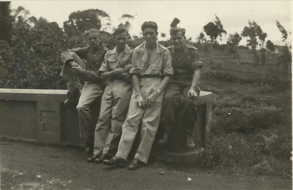 Nederlands Indië; muurtje, vier militairen boom