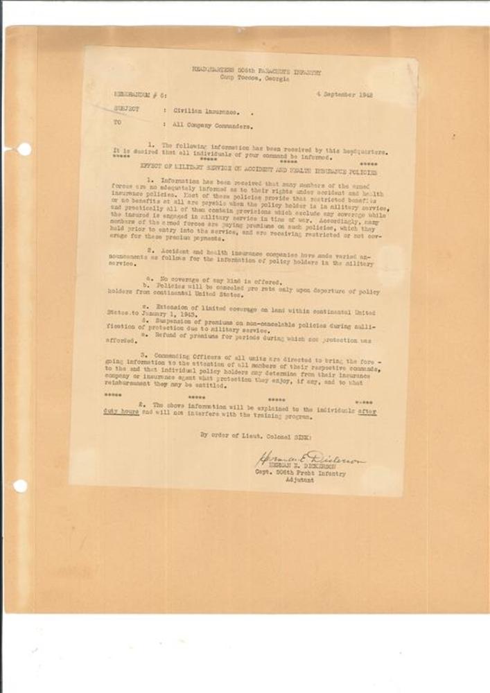 Brief. Memorandum Civilian Insurance. Camp Toccoa, s...