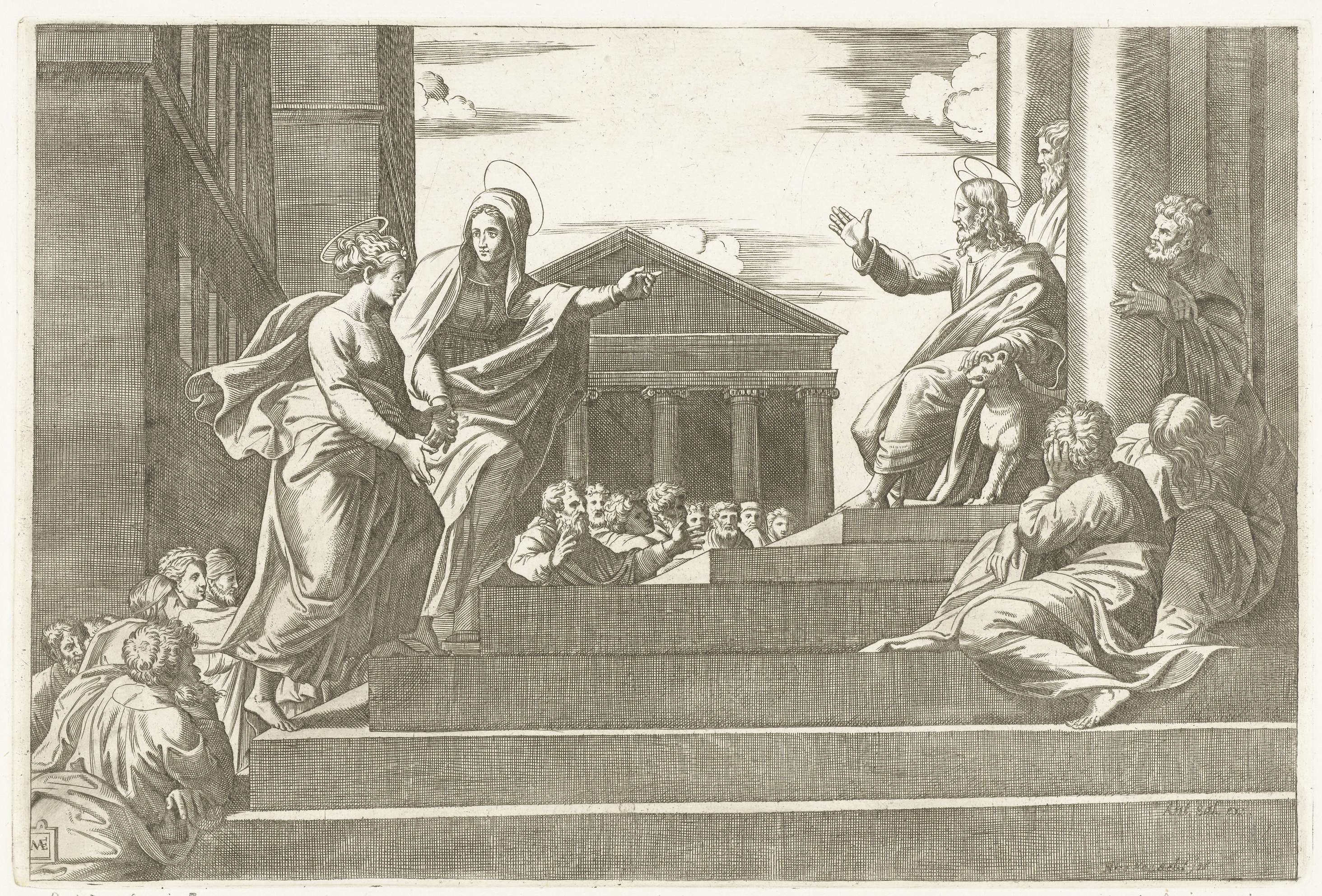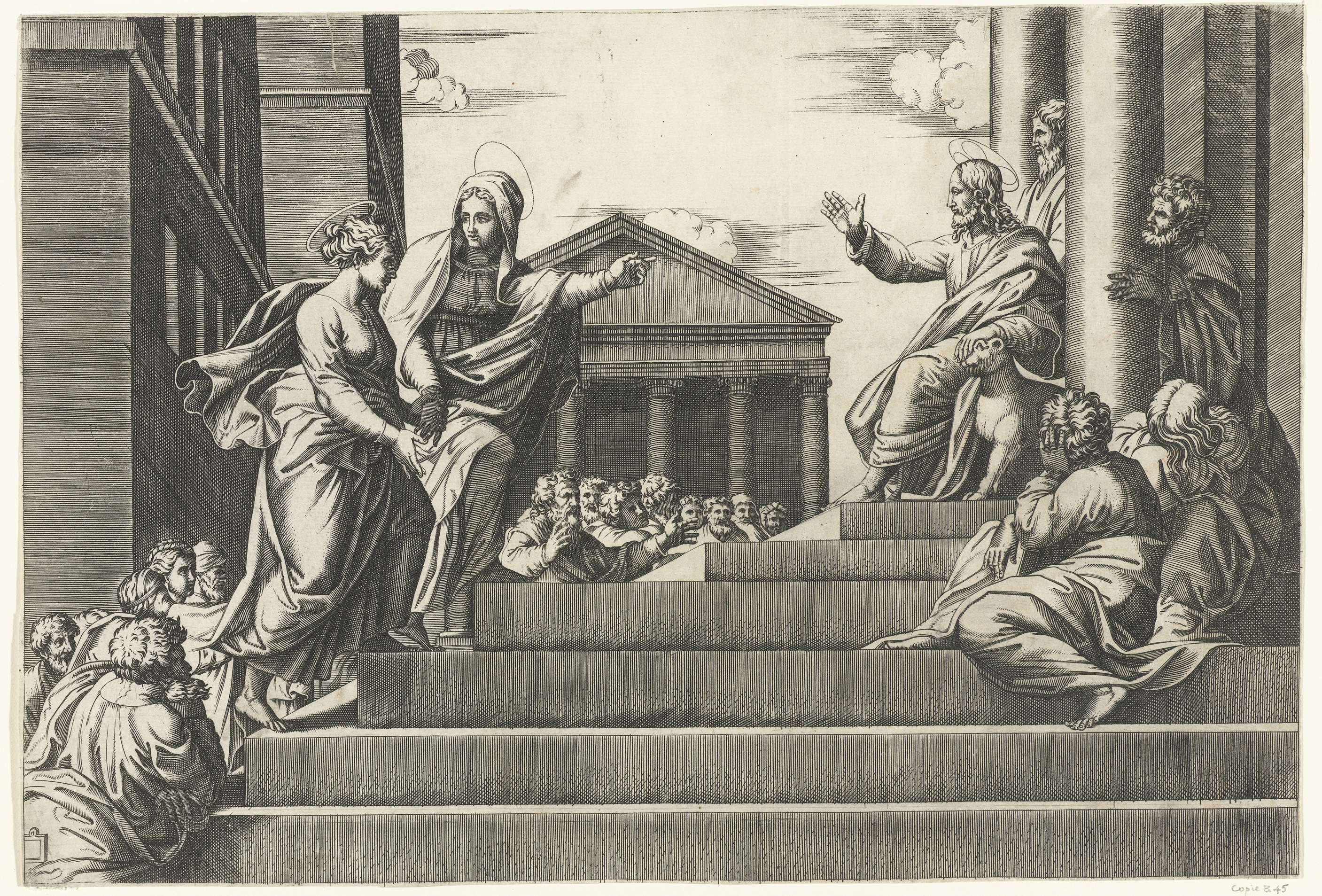 Maria met kind zittend op een troon tussen de heilig...