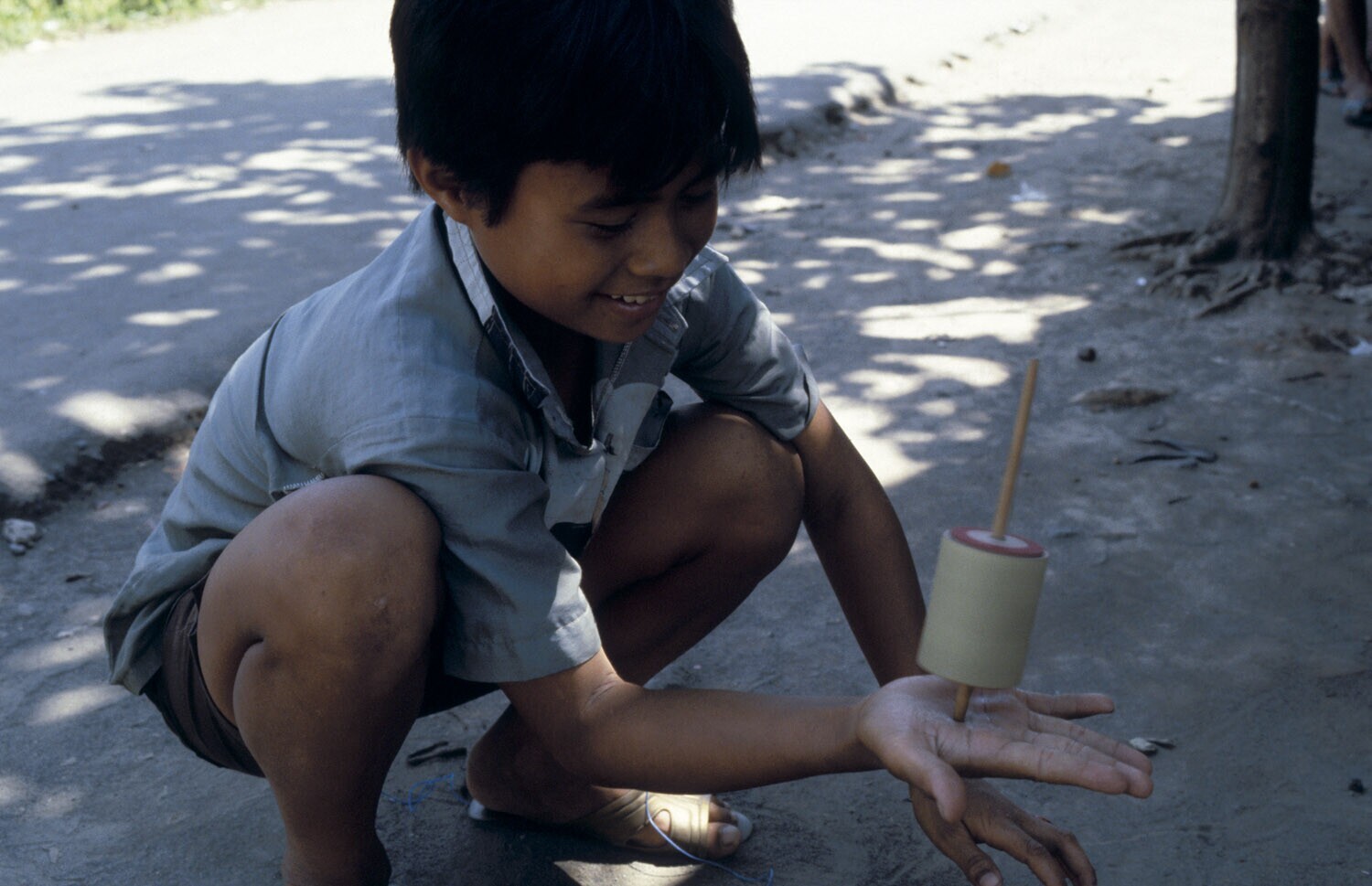 Jongetje speelt met een tol, hij verkoopt ze ook. Me...