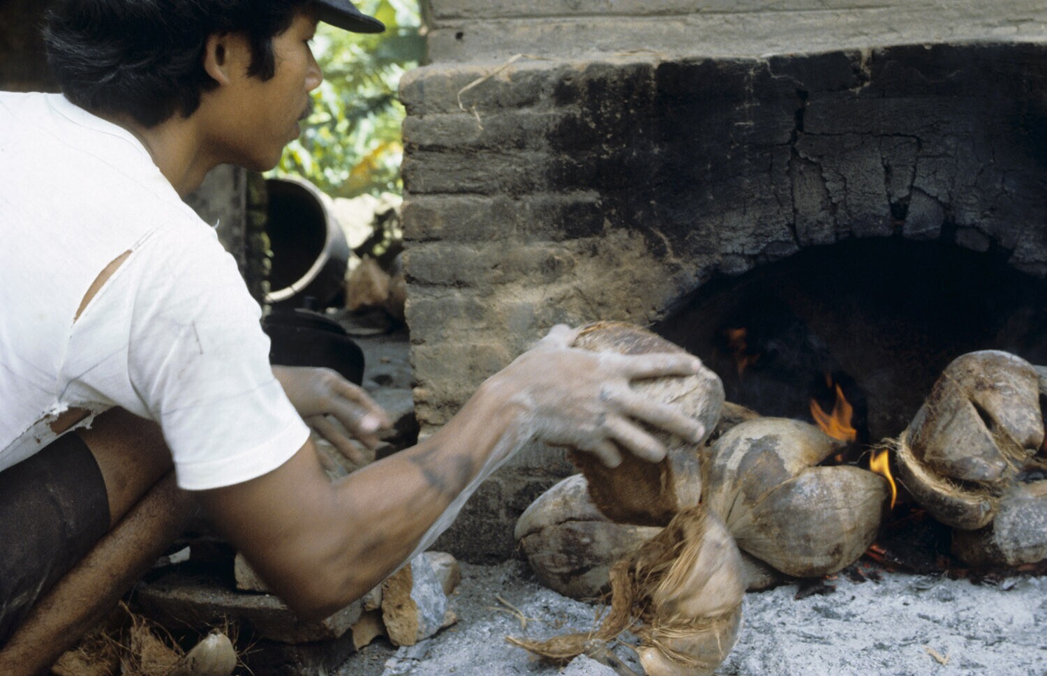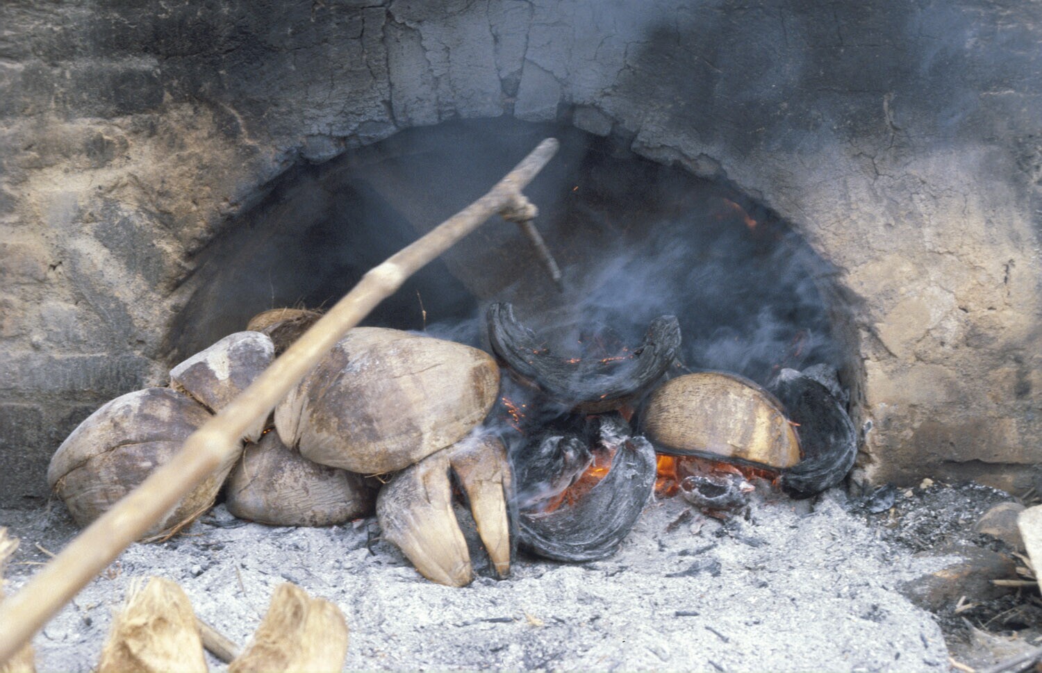 Het opstoken van de pottebakkersoven met klapperschi...