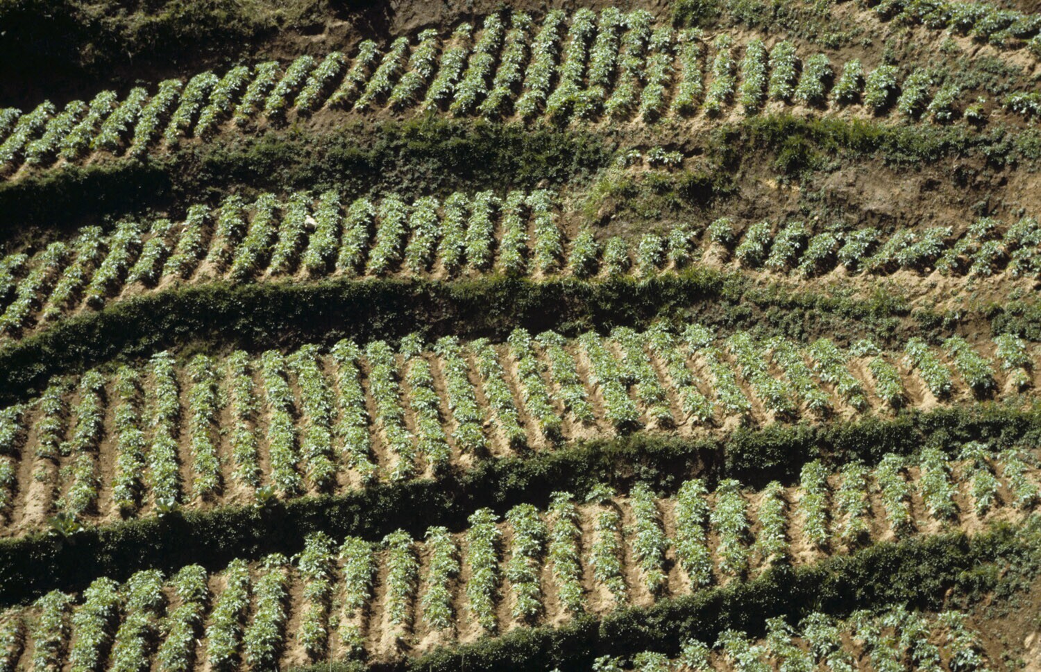 Aardappelvelden langs de weg naar het Diengplateau. ...