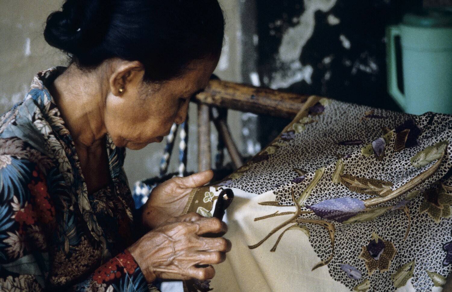 Batikster is bezig met de canting(waspen) in het ate...