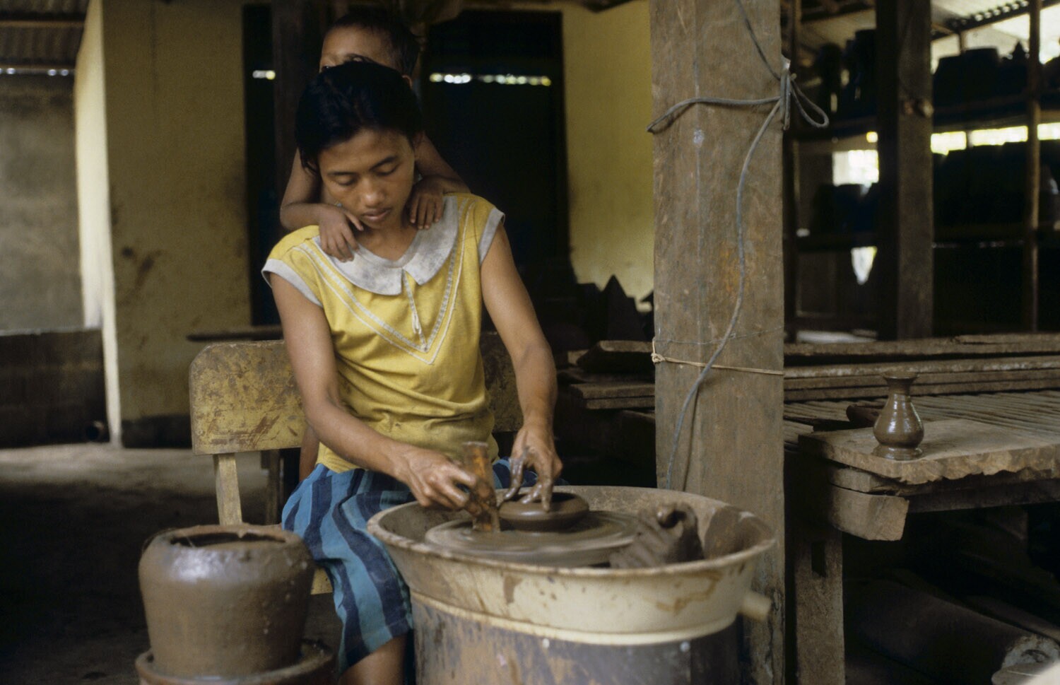 De pottenbakster aan het werk terwijl haar kind acht...