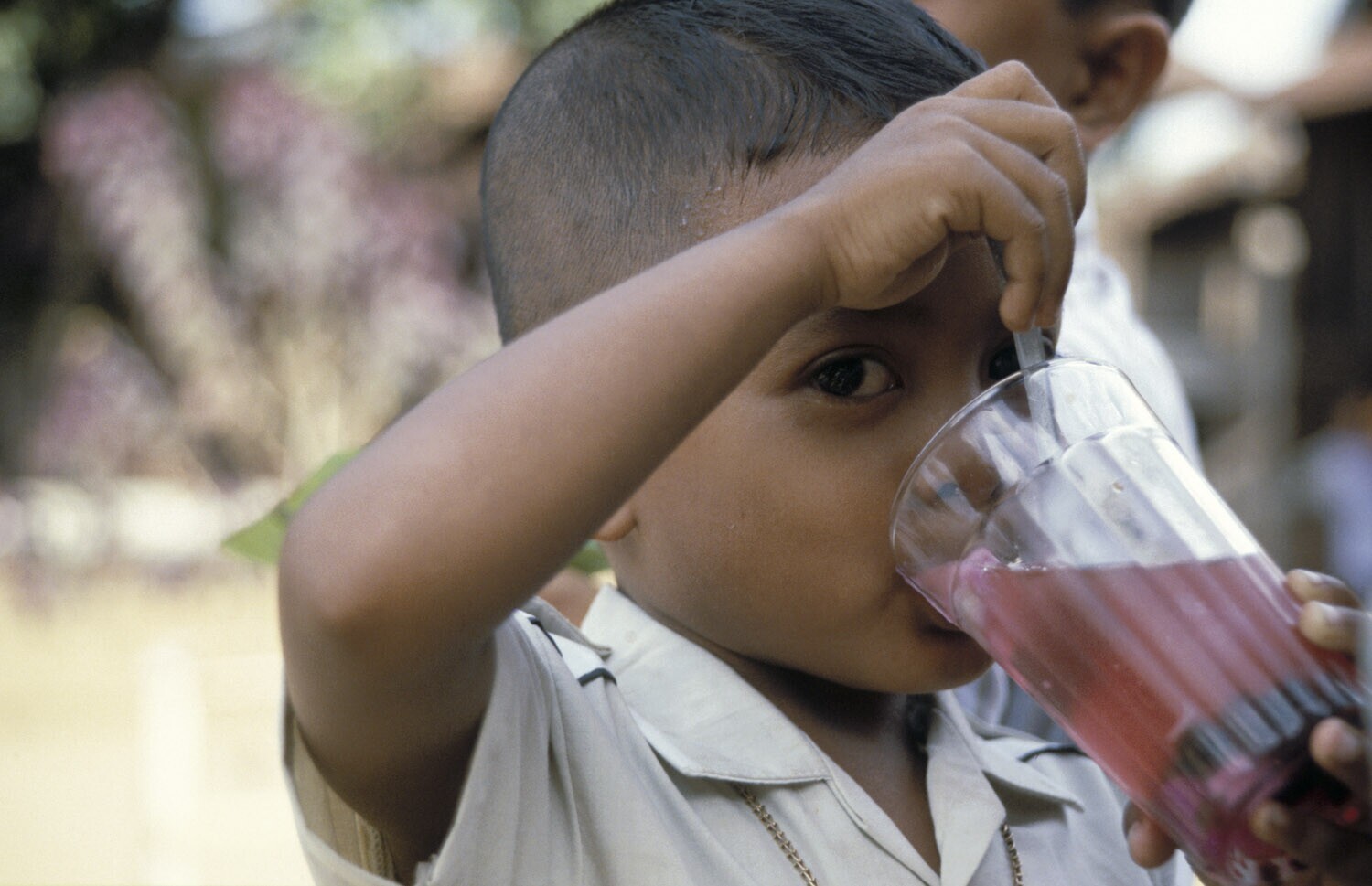 Kleine jongen met een groot glas stroop susu op de m...