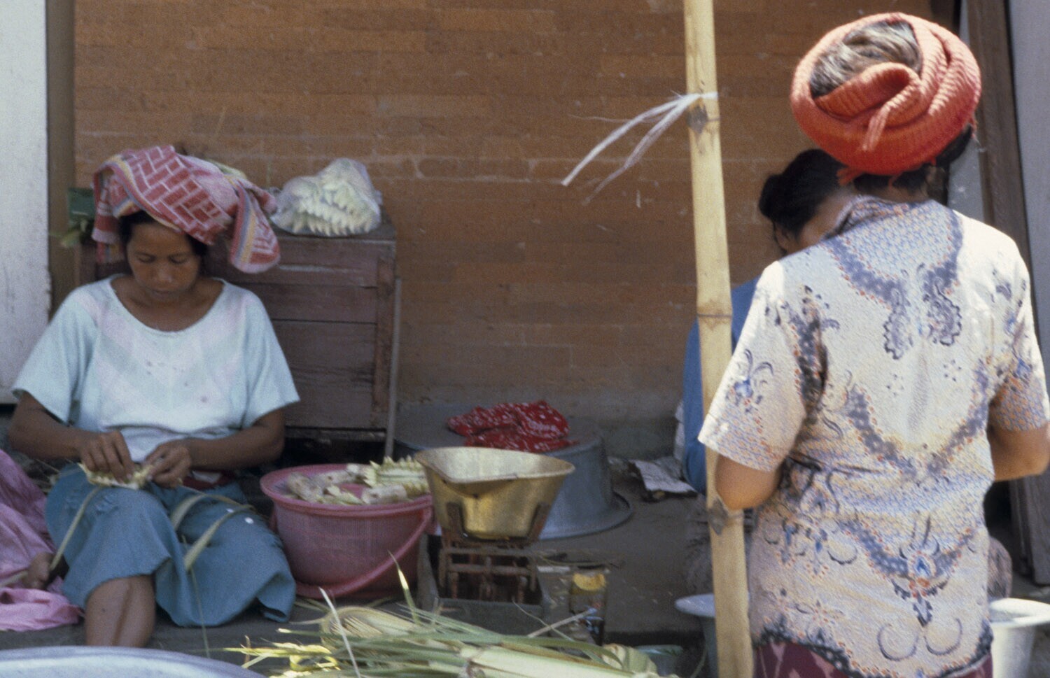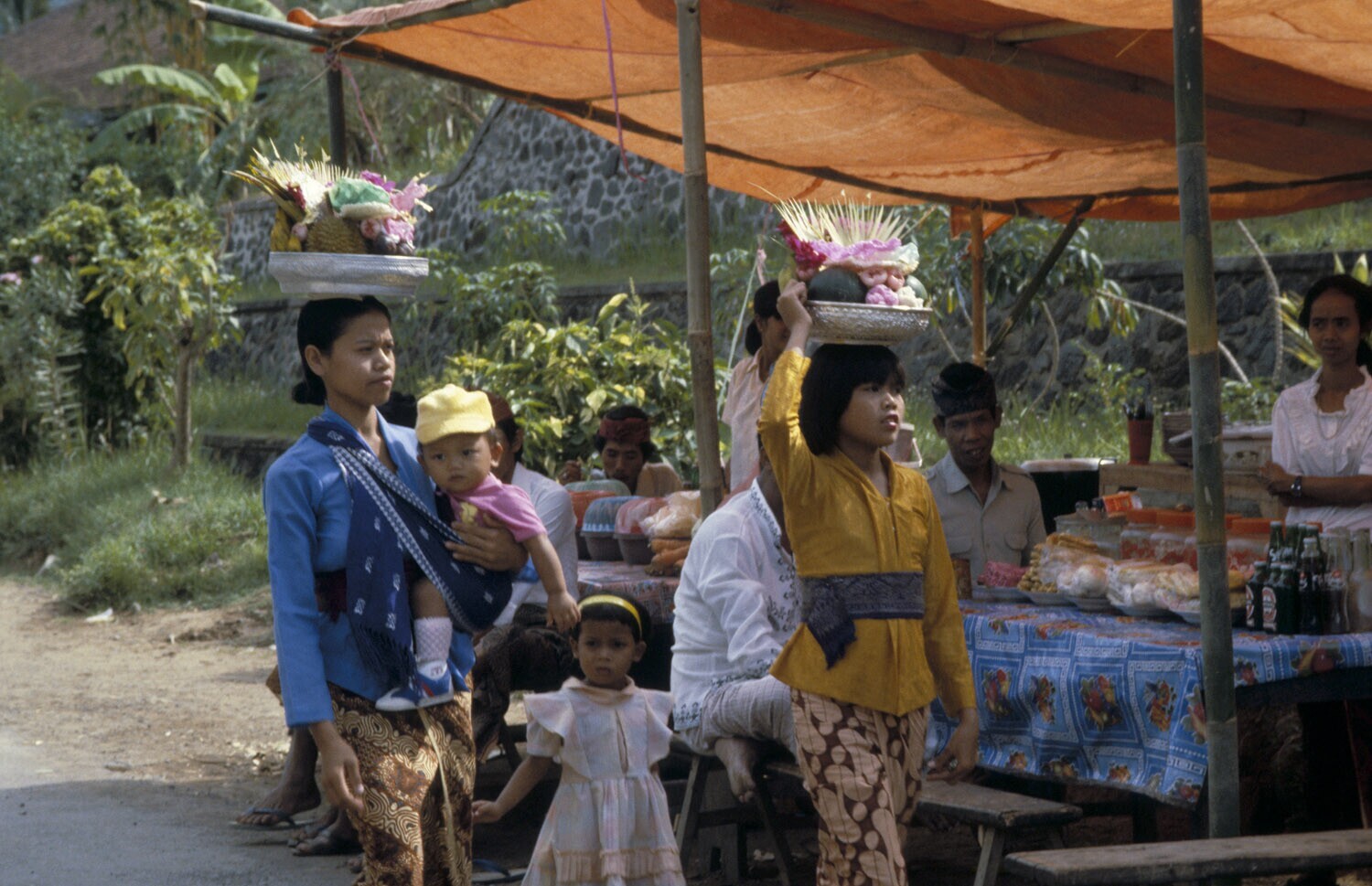 Vrouwen leggen voedseloffers in de tempel neer. Sawa...