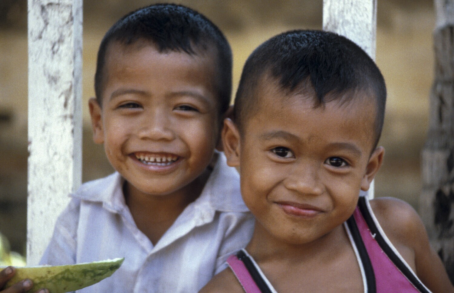 Twee breed grijnzende jongens, één met een stuk melo...
