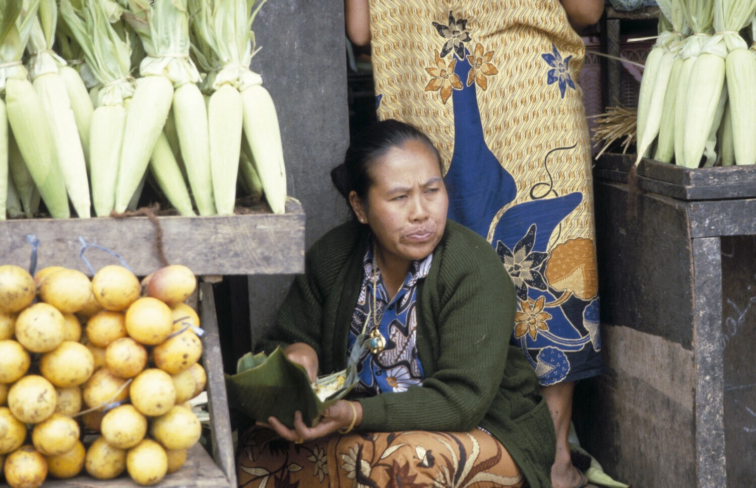 Man met een schaal bananen op de markt, Bali.