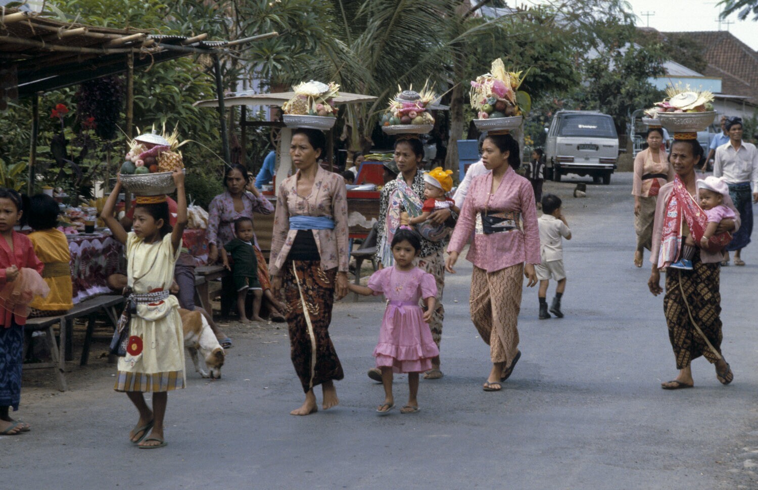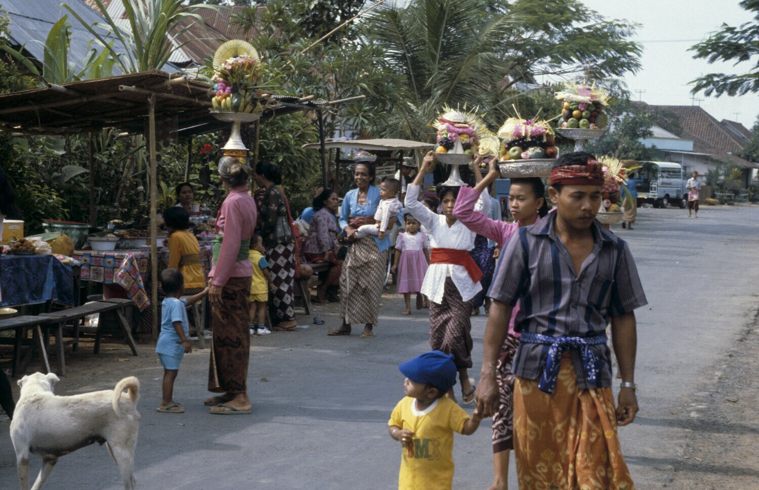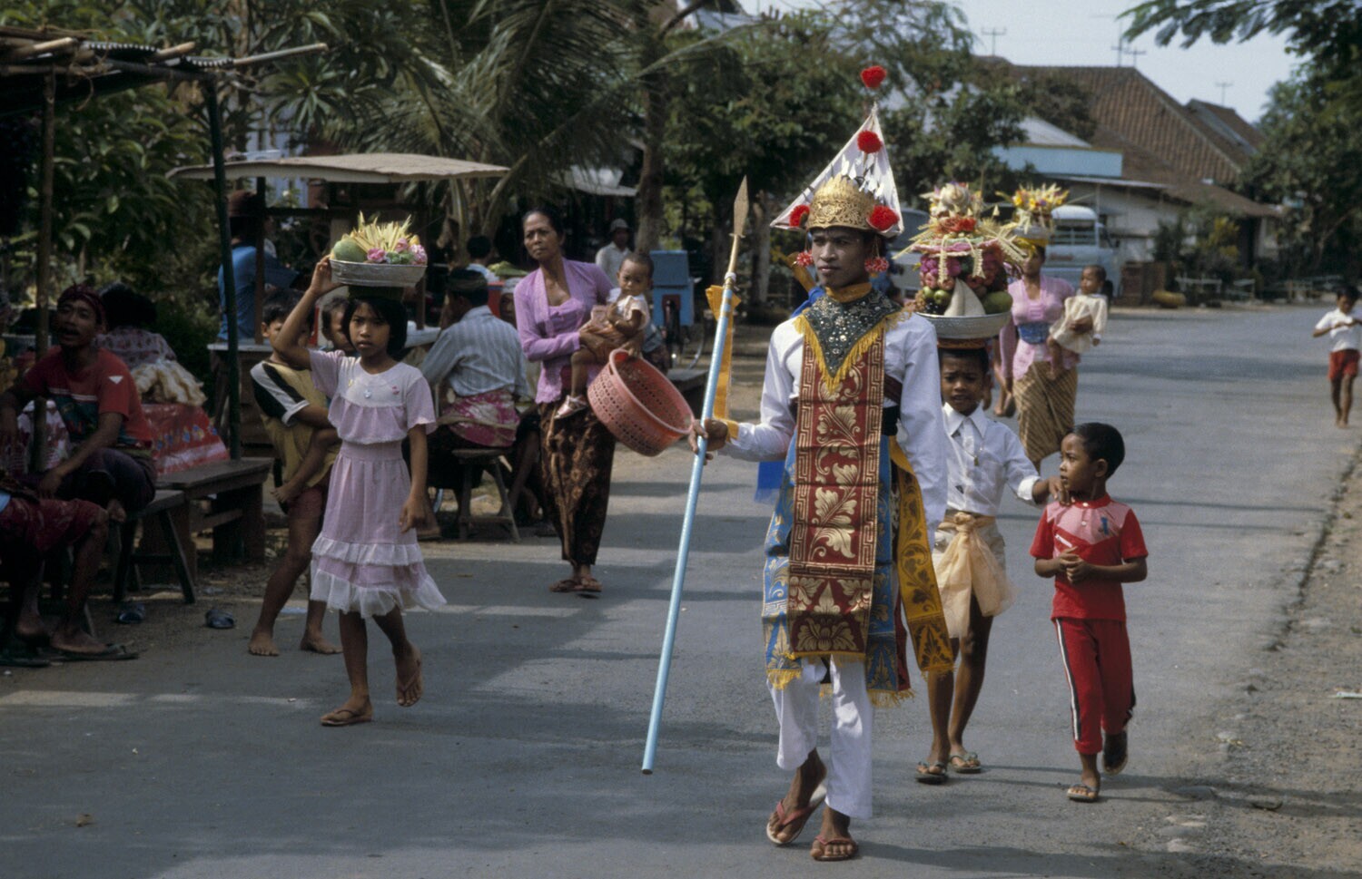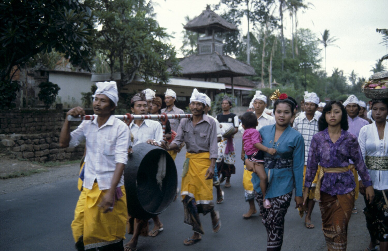 Processie even buiten Denpasar, Bali.