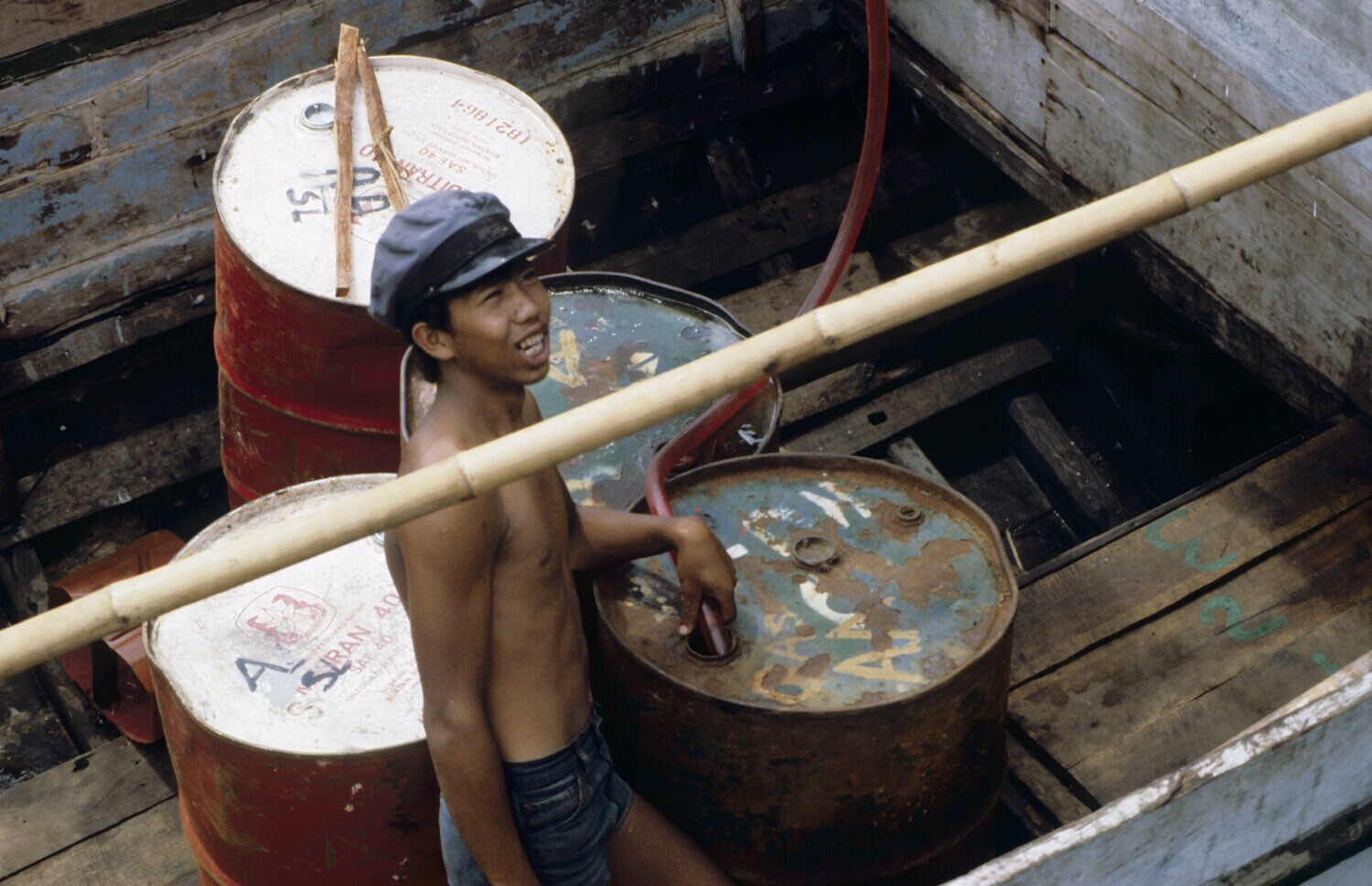 Jongen tankt benzine voor een boot in de haven van S...