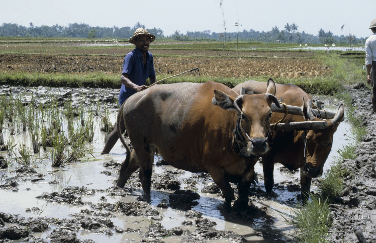 Boer ploegt een rijstveld met een span karbouwen, Bali.