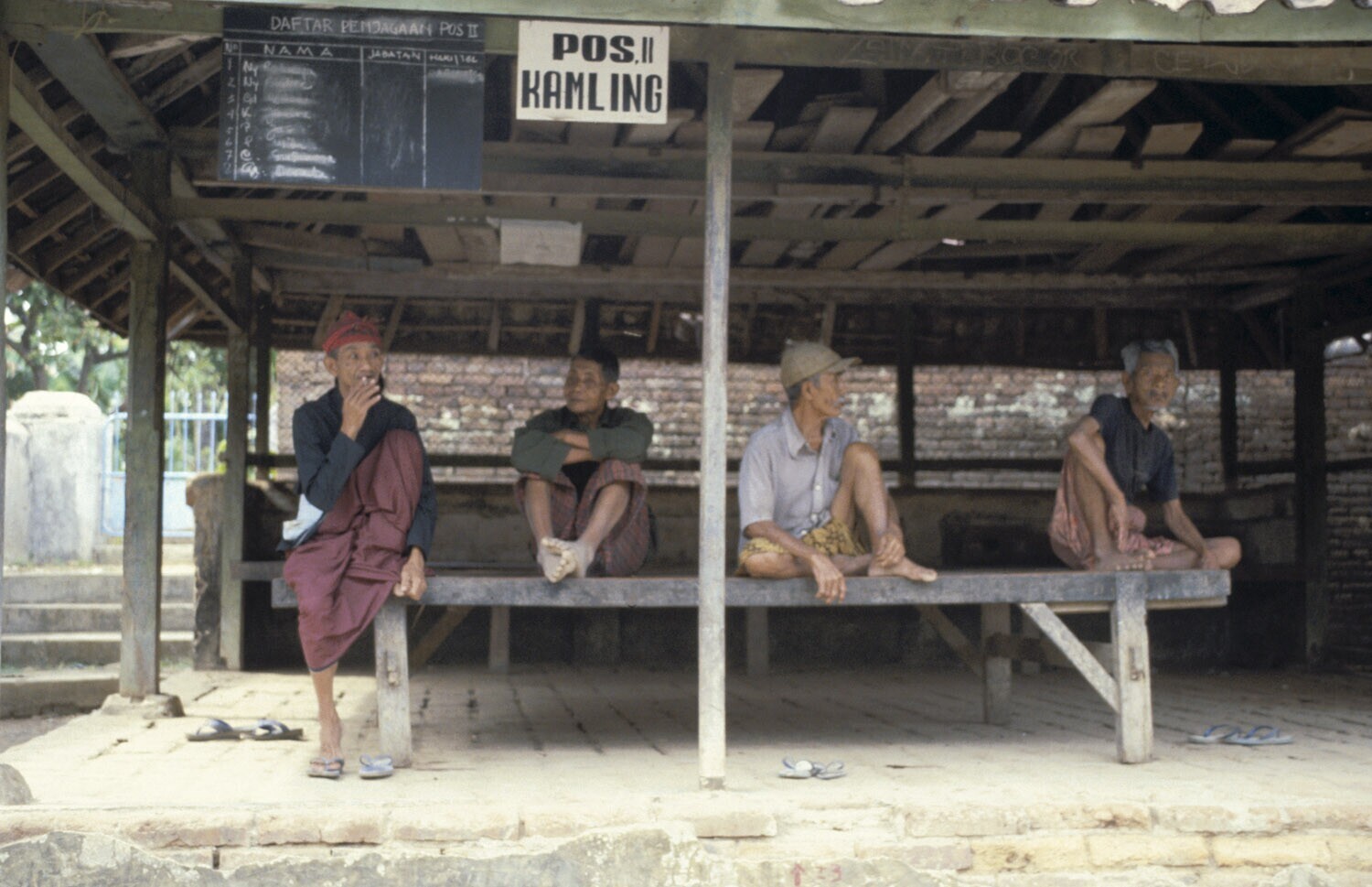 Wachtende mannen onder een afdakje bij Pos Kamling I...