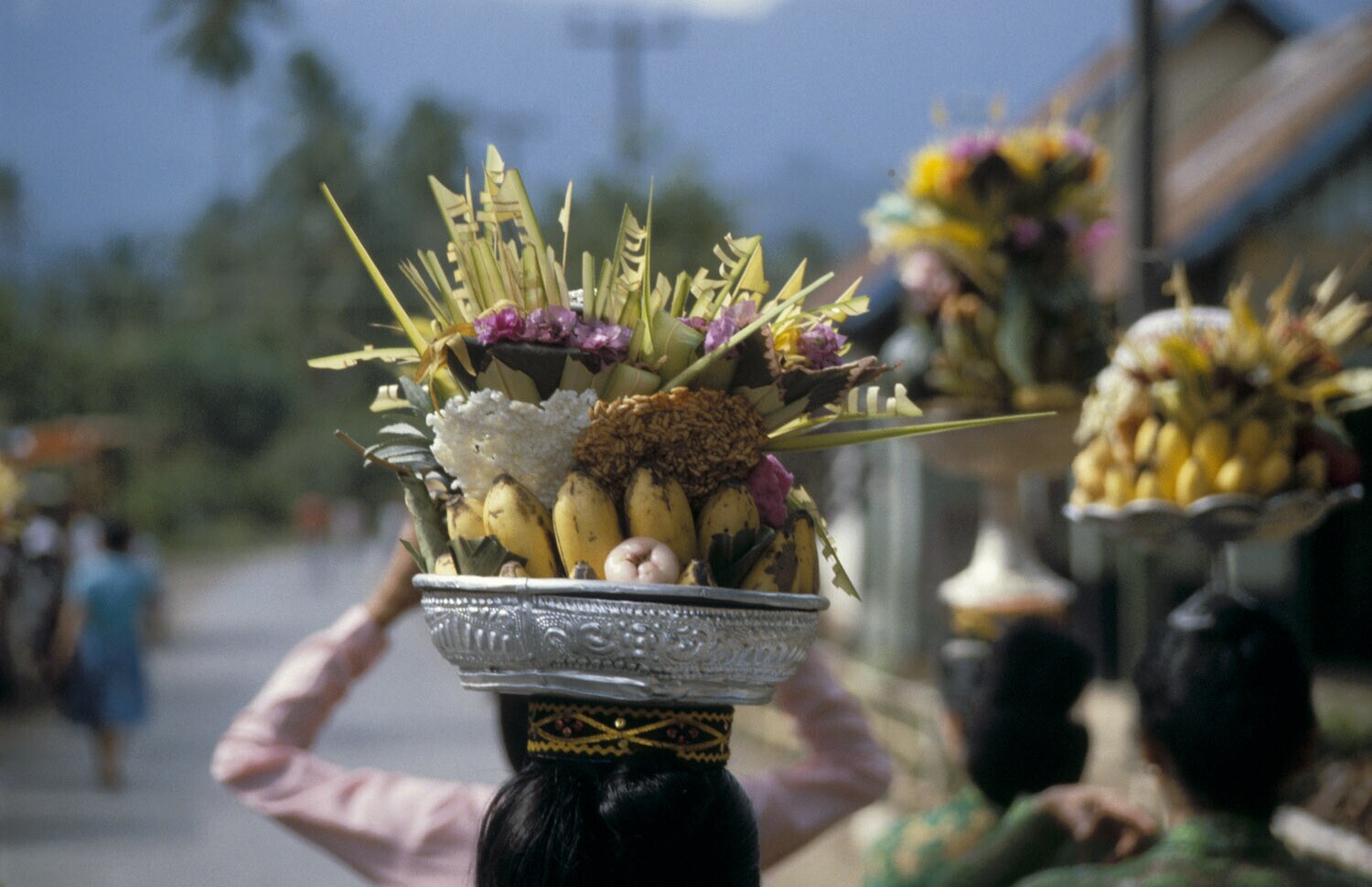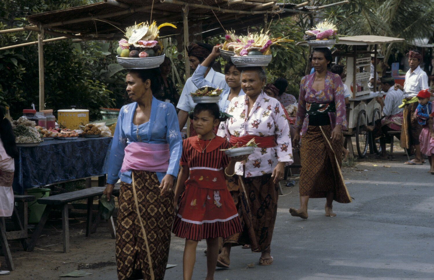 Vrouwen brengen voedseloffers naar de tempel. Sawan,...