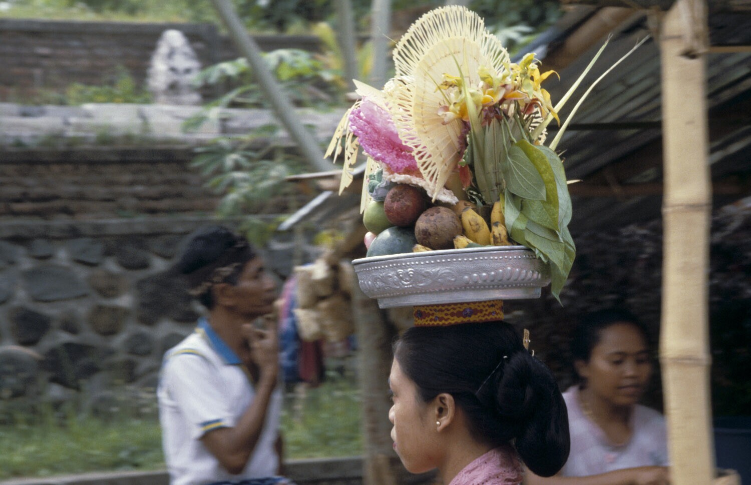 Vrouw brengt voedseloffer naar de tempel. Sawan, Bali.