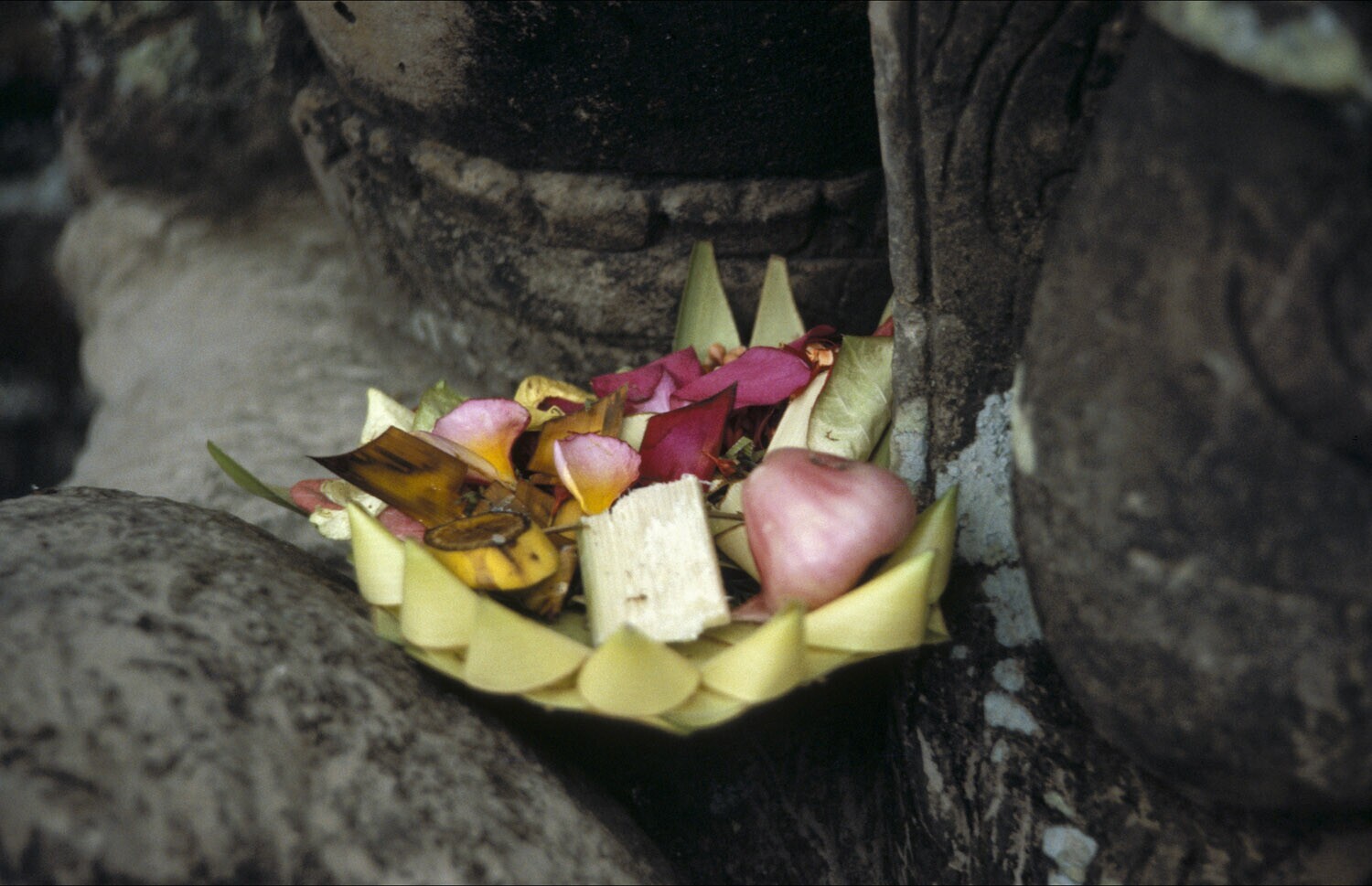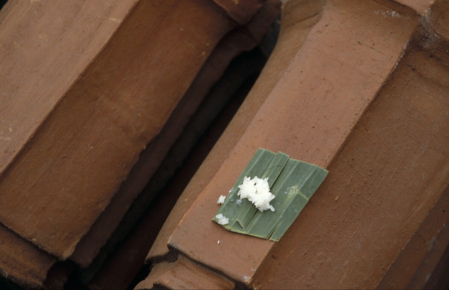 Close-up van een voedseloffer, op een gevouwen blad....