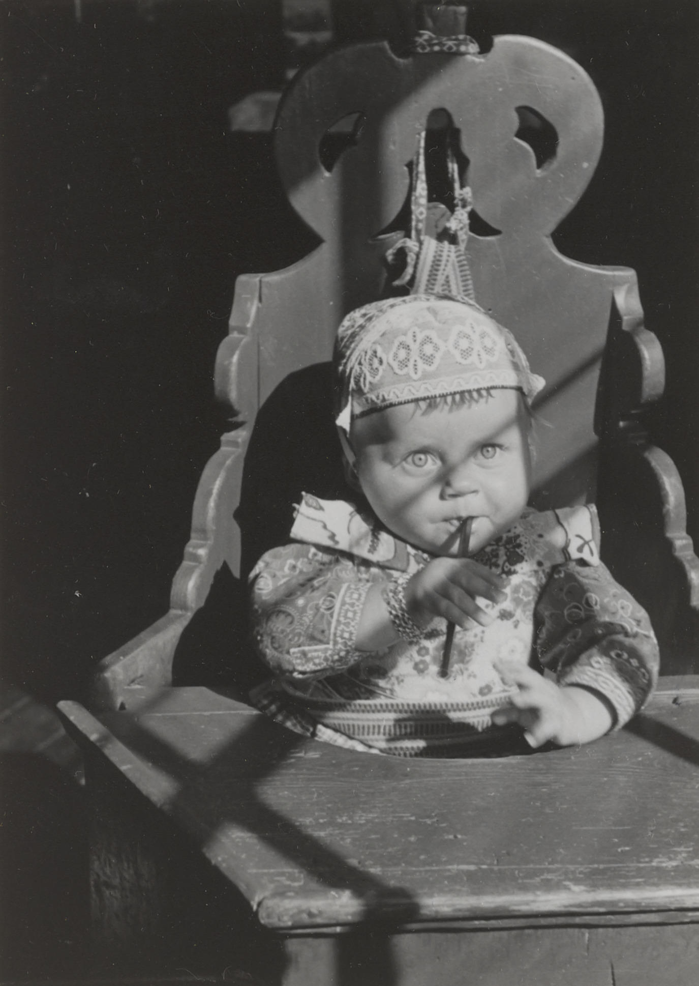 Meisje in kakstoel, Marken, 1943 (zwart-wit foto)