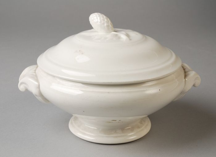 Wit geglazuurde miniatuur soepterrine met twee handg...