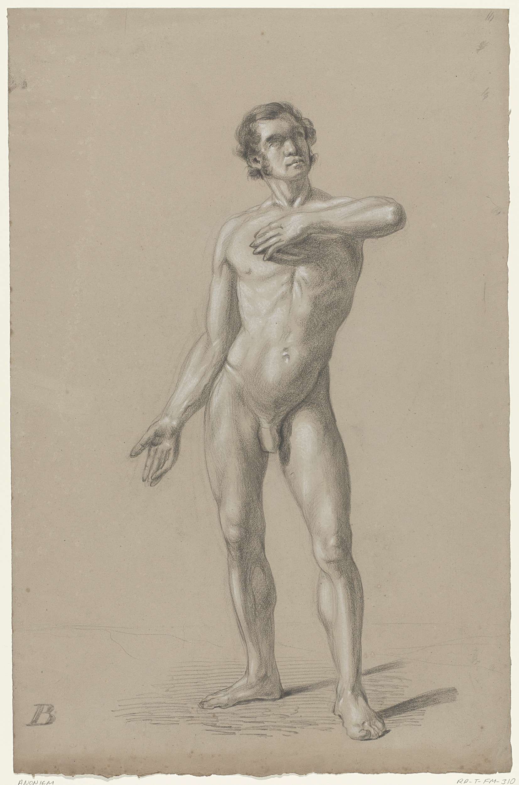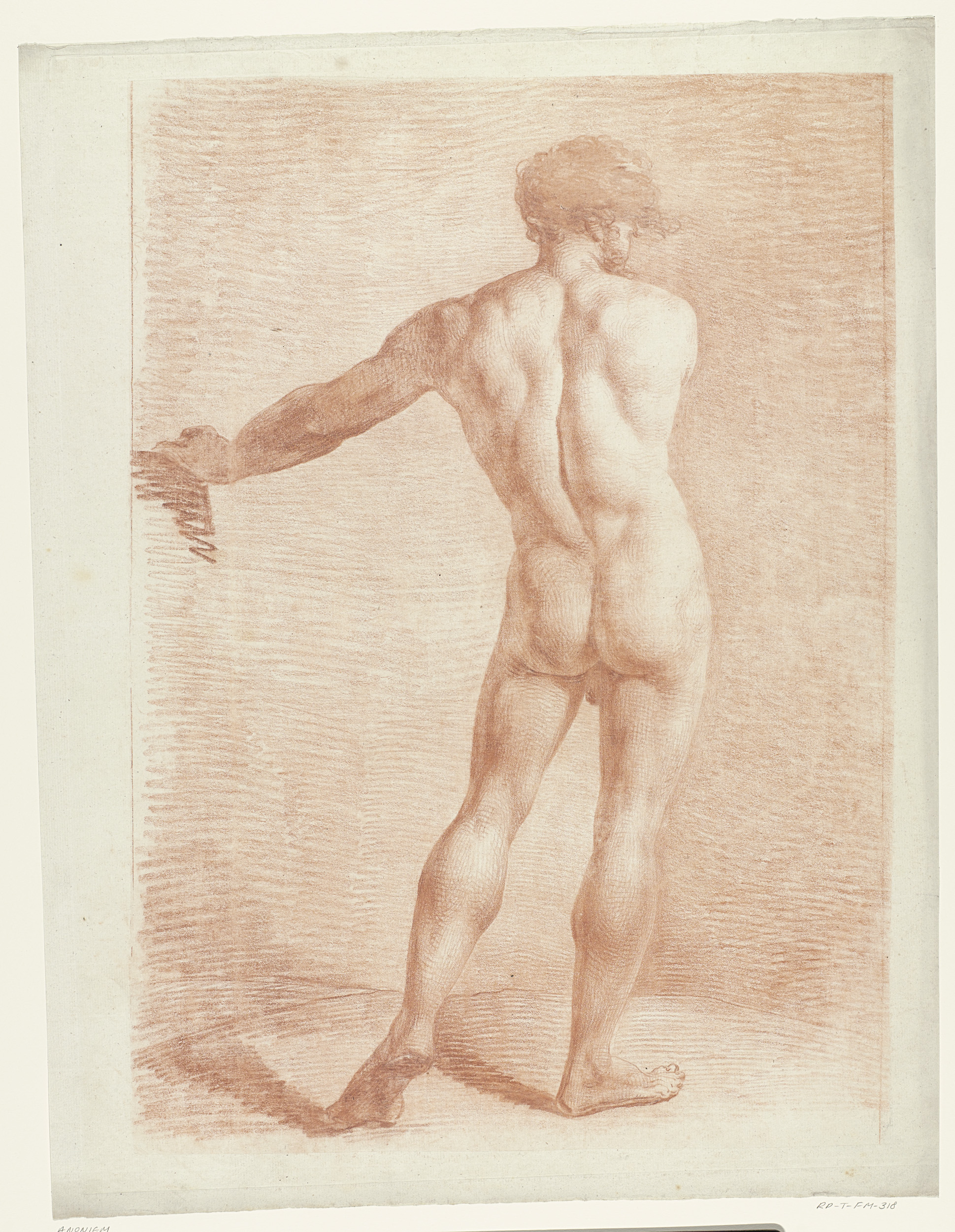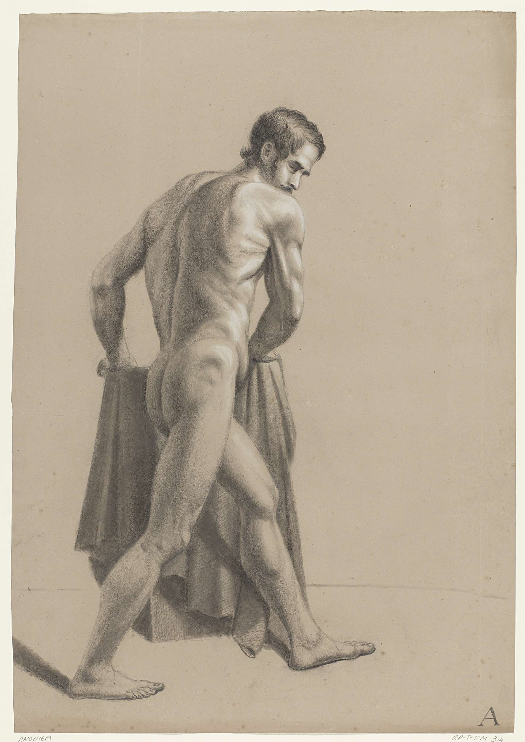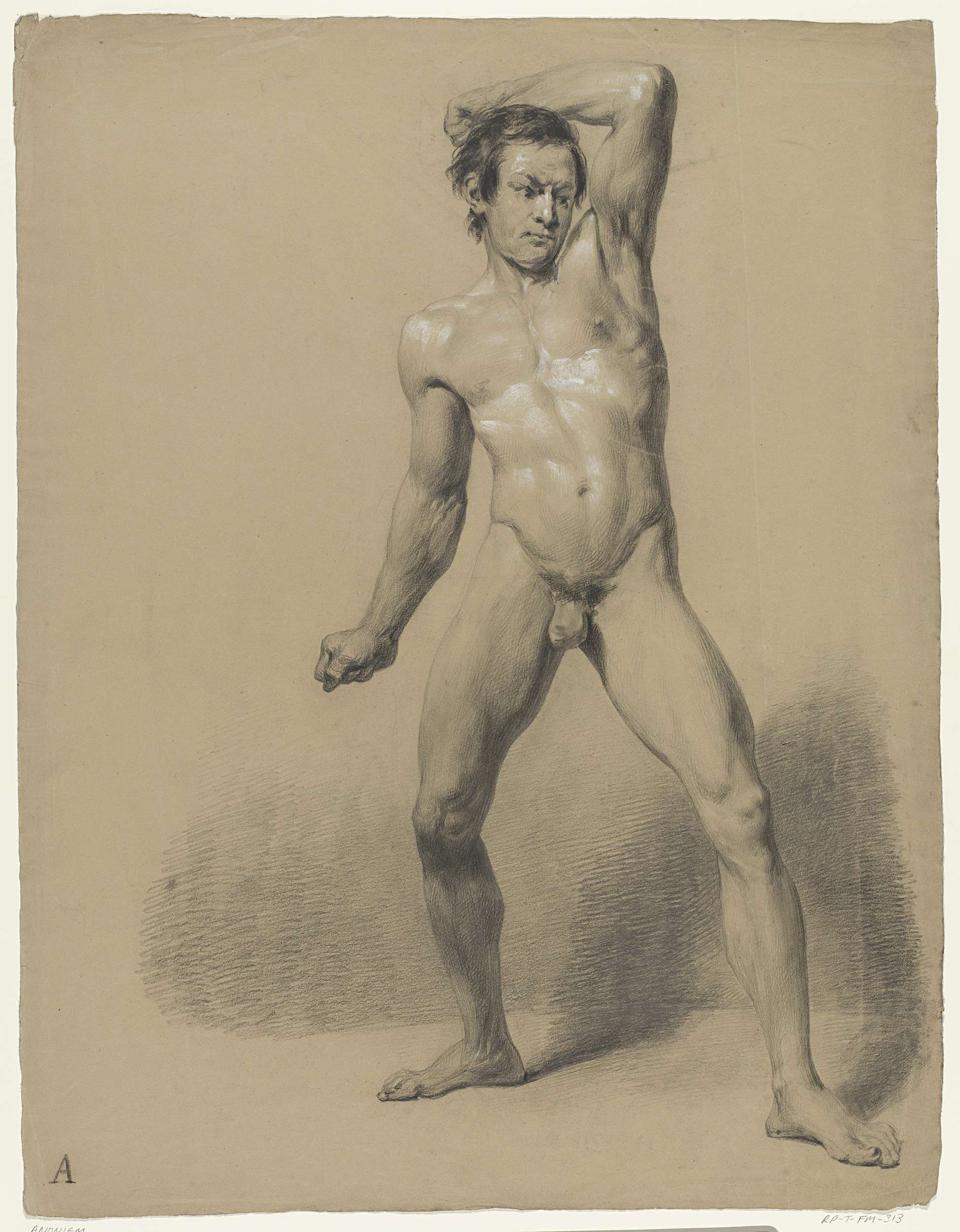 Staand mannelijk naakt met opgeheven arm, van achter...