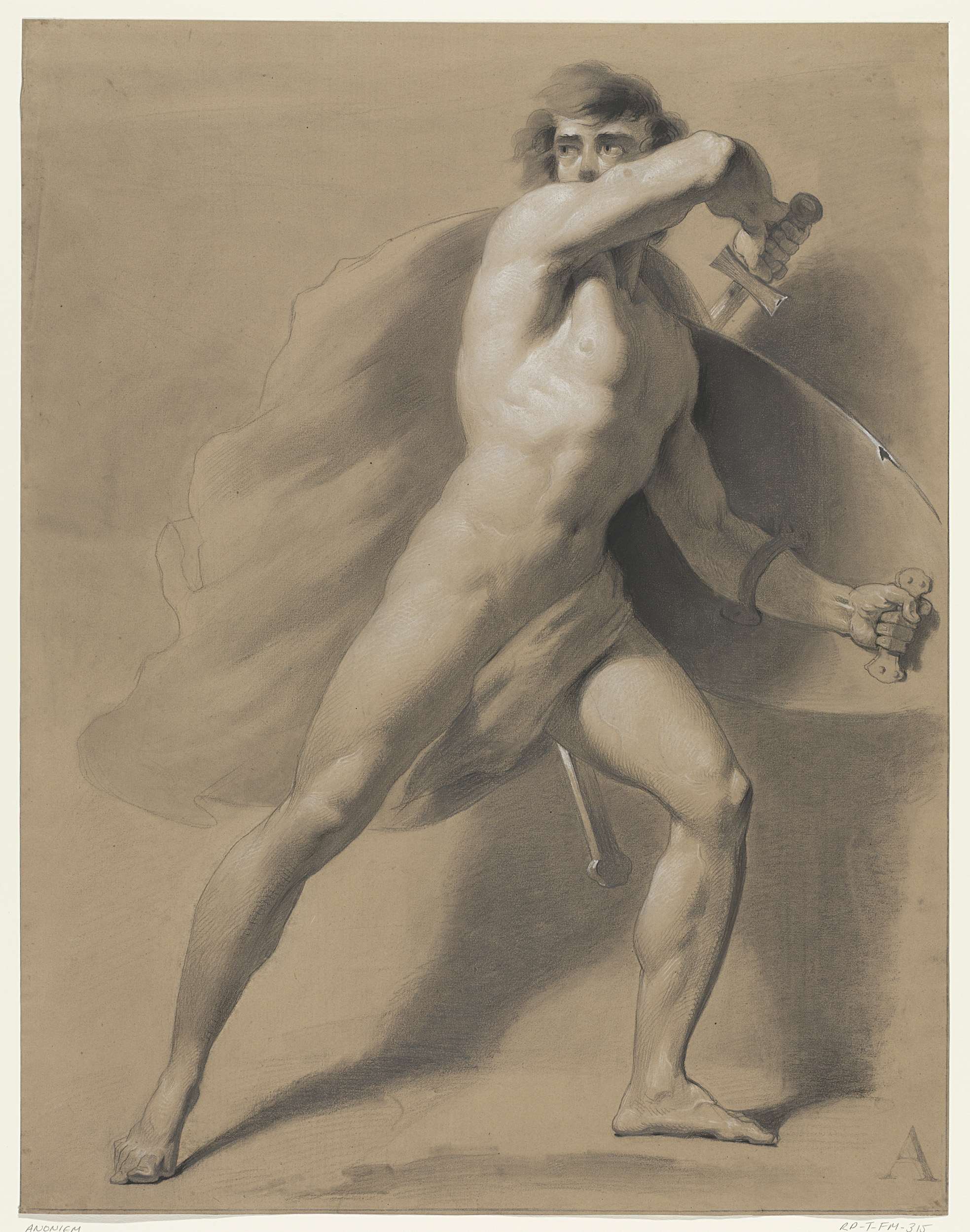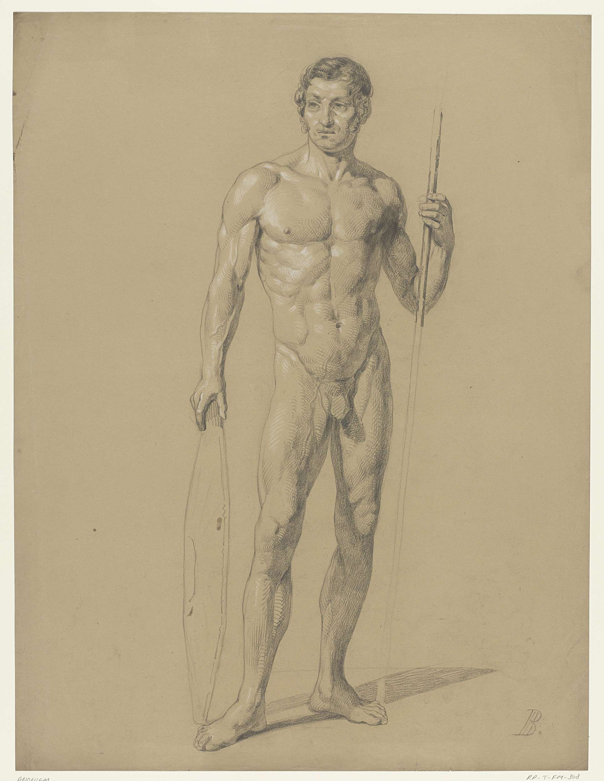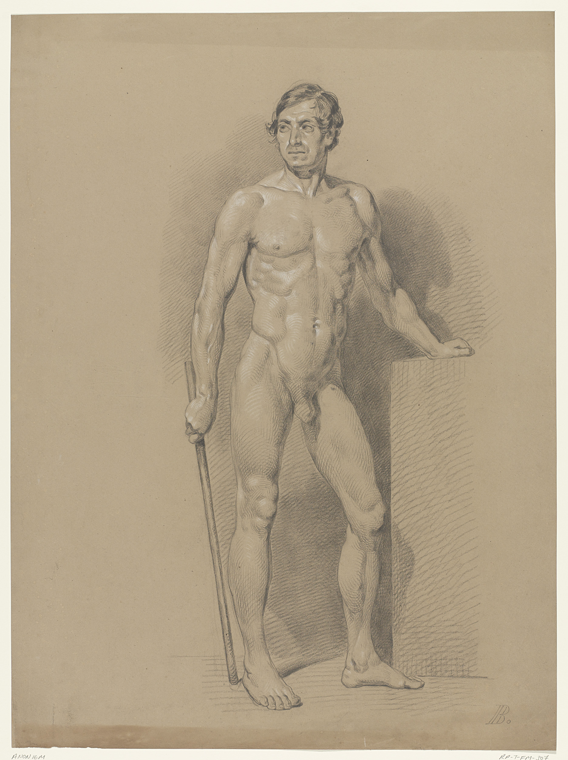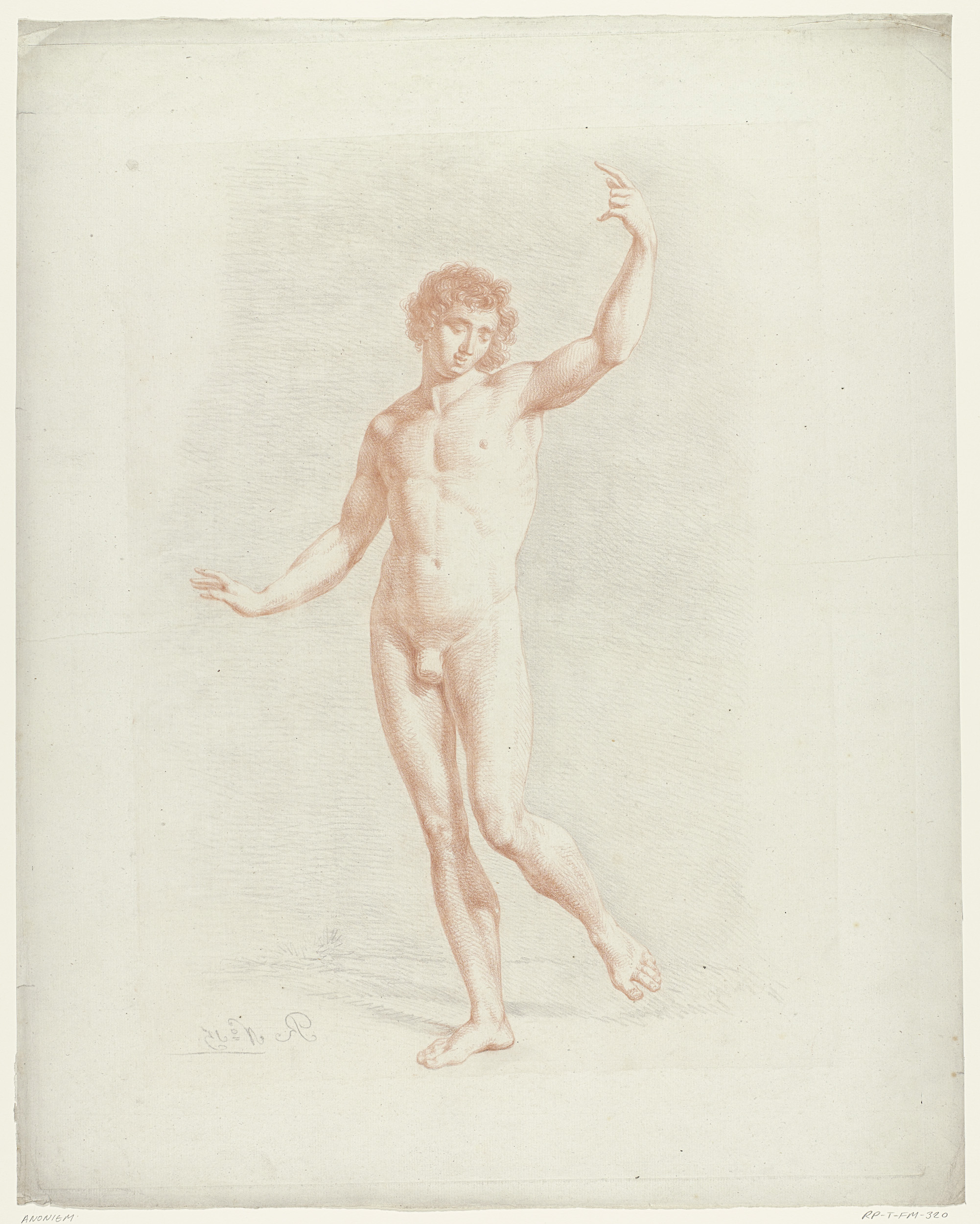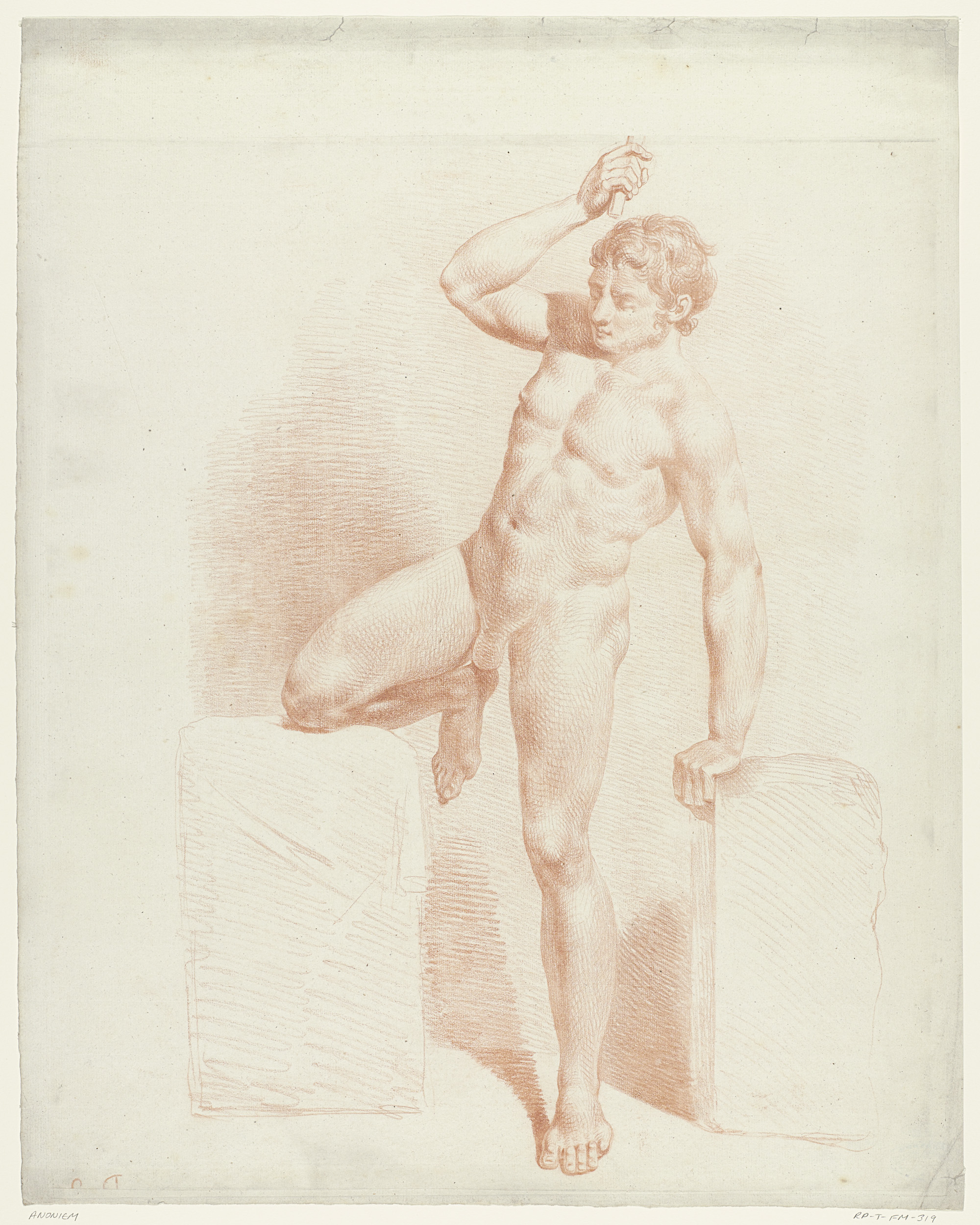 Staand mannelijk naakt met opgeheven arm, van achter...