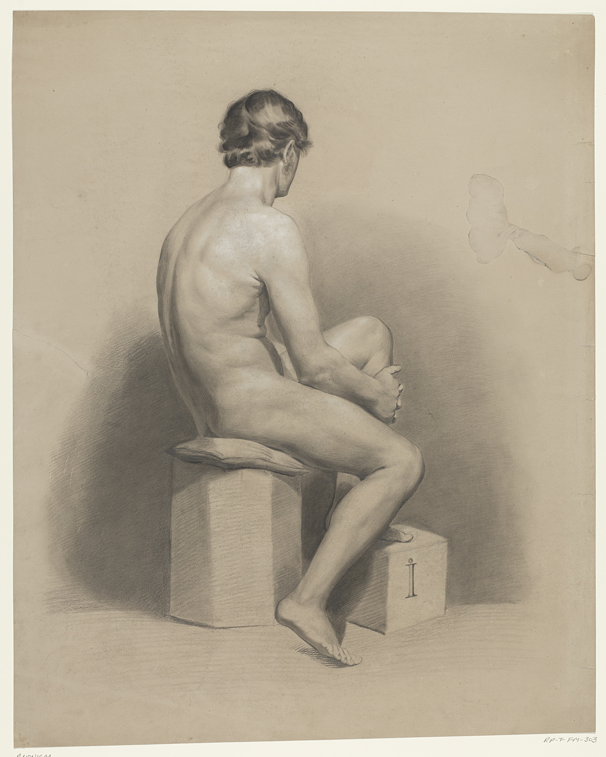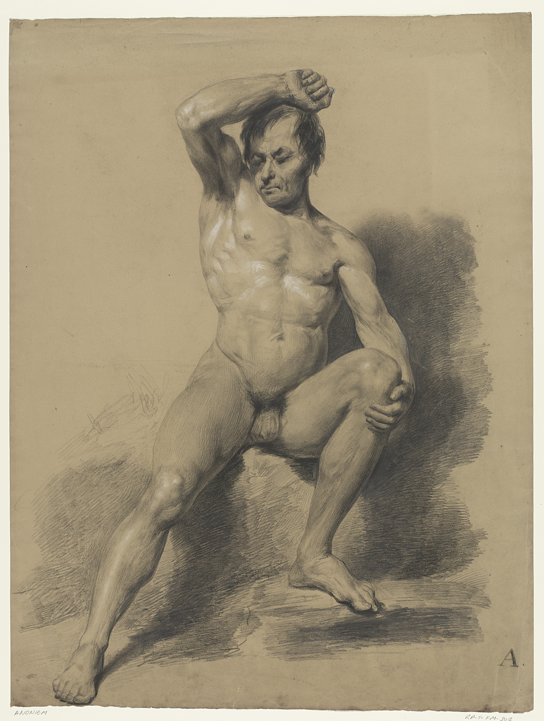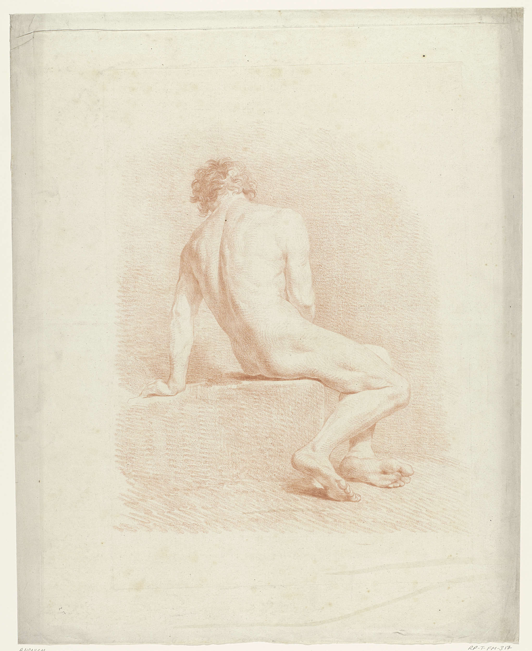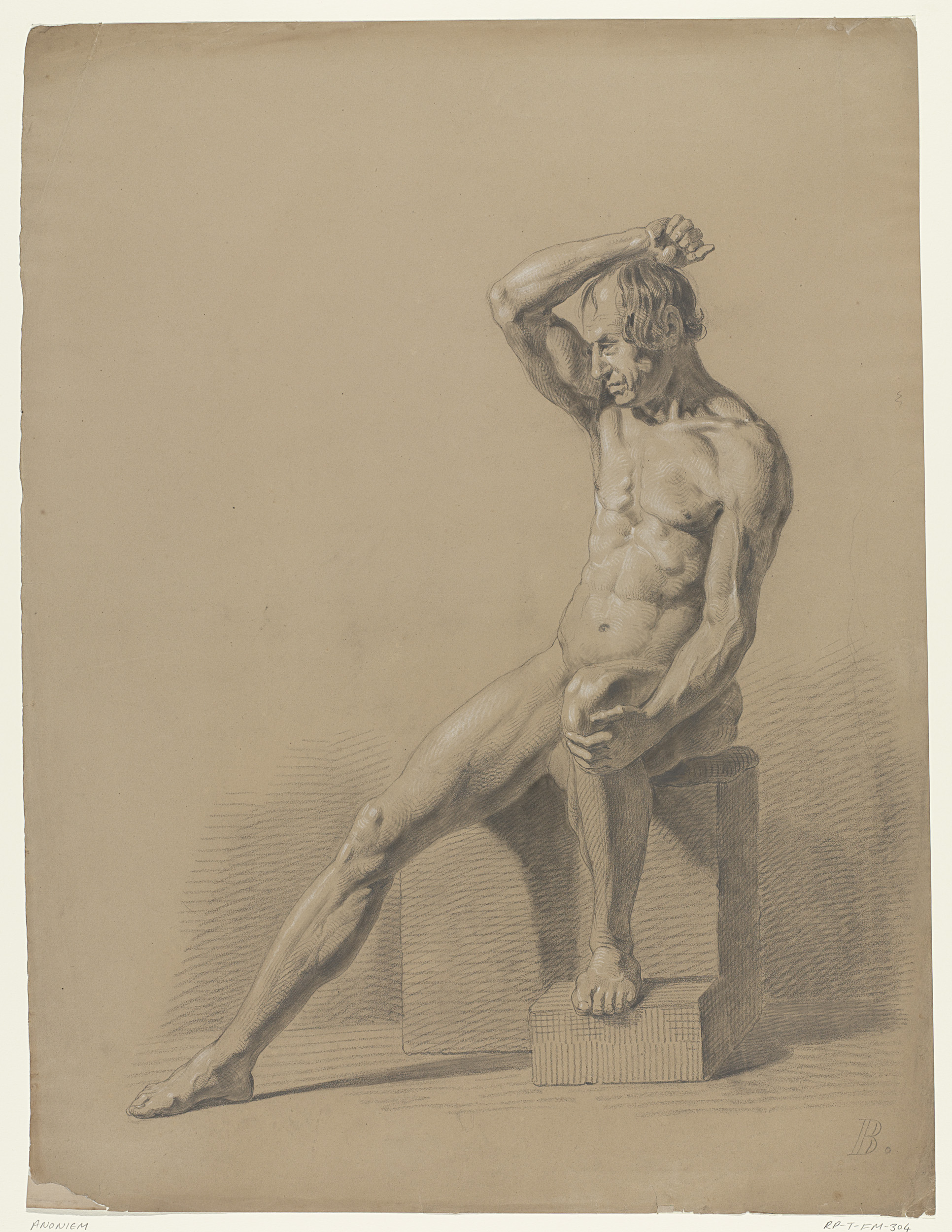 Zittend mannelijk naakt, op een blok, met gestrekt b...