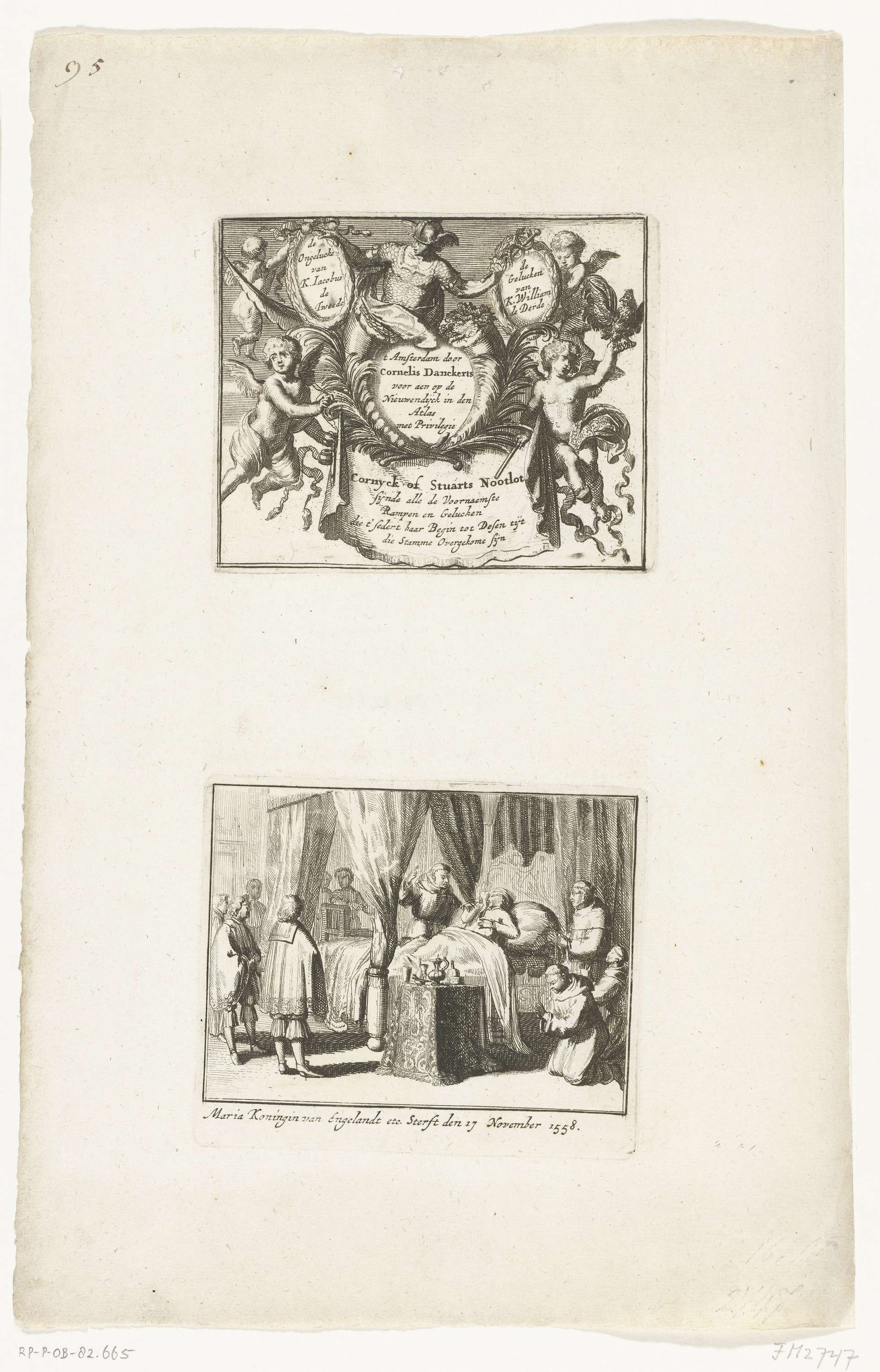 Blad met titelprent en de dood van Maria Tudor in 1558