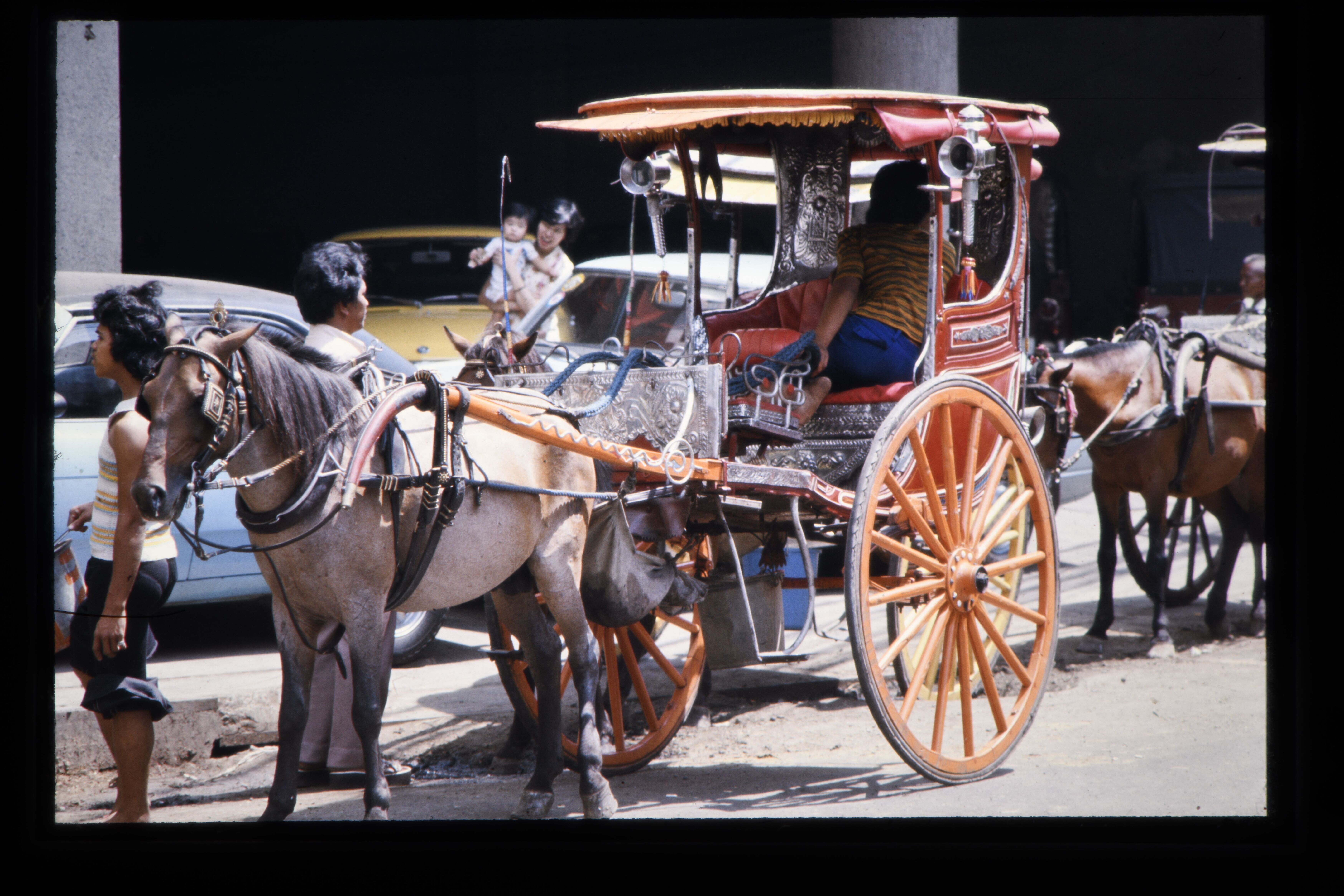 '"Fiacre", tweewielig rijtuig getrokken door een paa...
