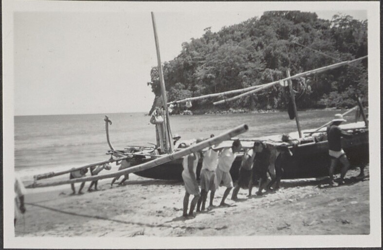 Vissers met netten in de branding bij Tjisolok, Wijn...
