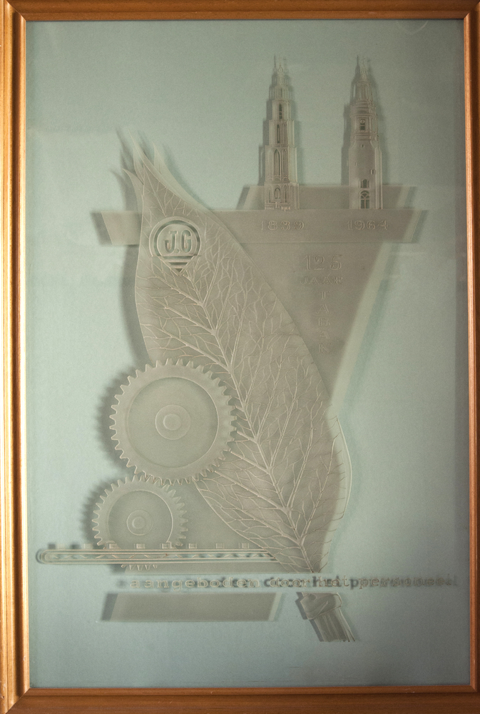 Geëtst herdenkingsraam van tabaksfabriek J. Gruno