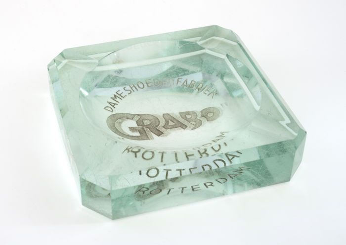 Glazen asbak van dameshoedenfabriek "GRABO" te Rotte...