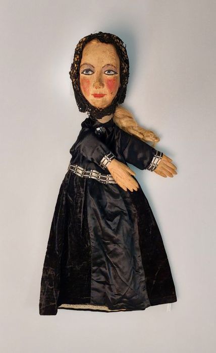Poppenkastpop: vrouwelijke figuur in zwarte kleding