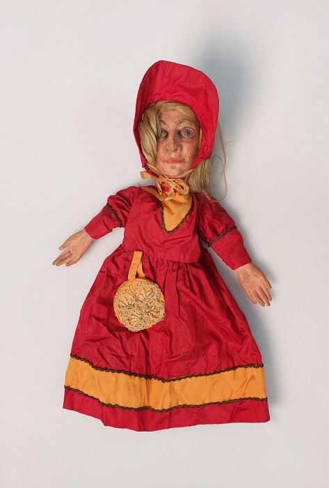 Poppenkastpop: vrouwelijke figuur in donkerrode kleding