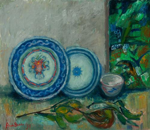 Stilleven met antieke borden.