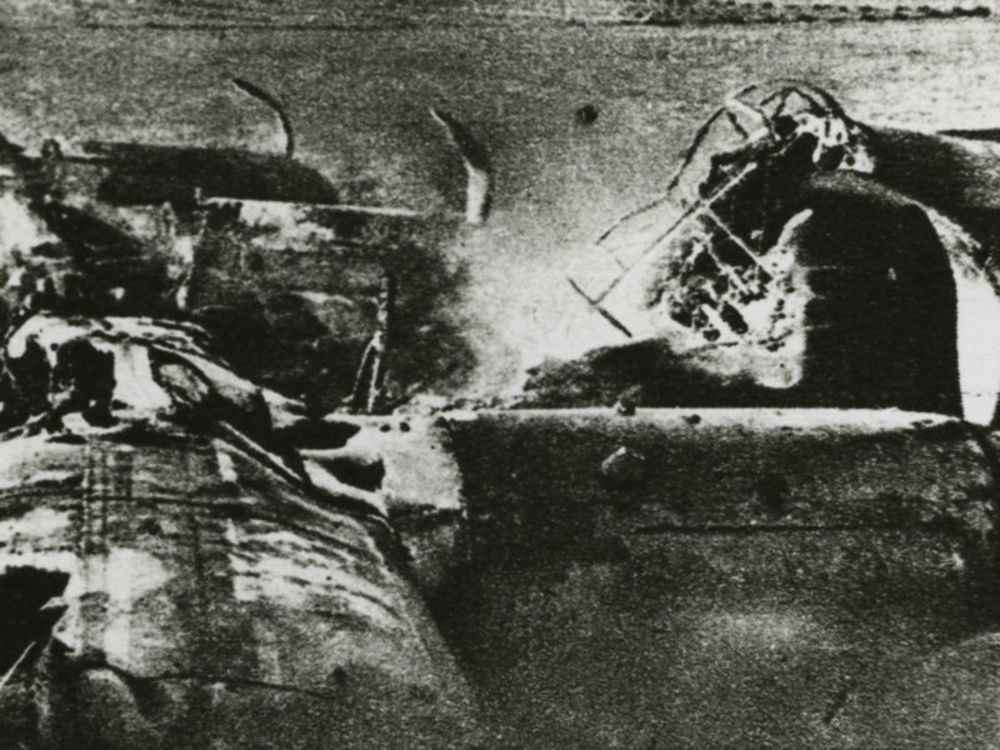 Foto van vleugel van vliegtuigwrak in weiland. Tekst...