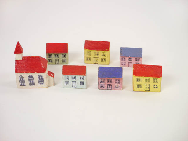 Dorp bestaande uit gebouwen, hekjes, bomen, popje, p...