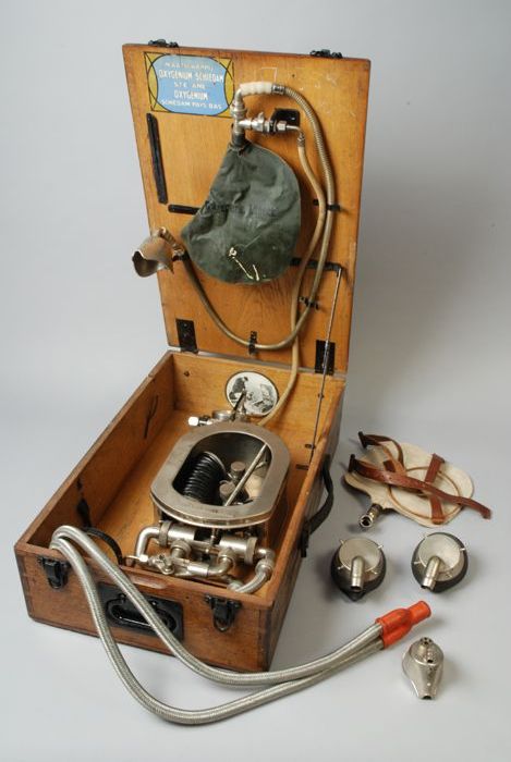 DRÄGER pulmotor in houten kist met sticker van OXYGE...