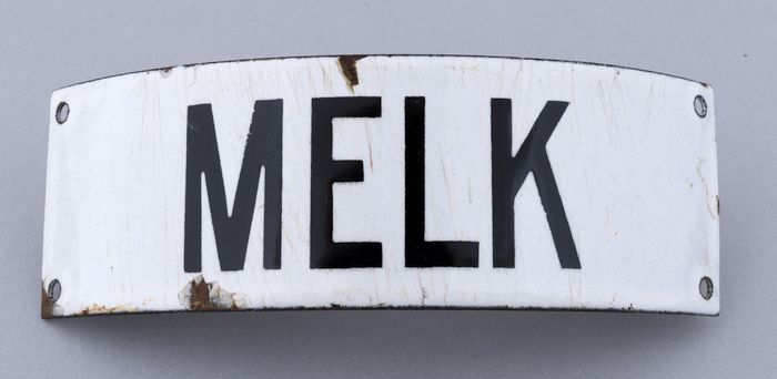 Zilverkleurige brug of sluis met geel stopbord, voor...