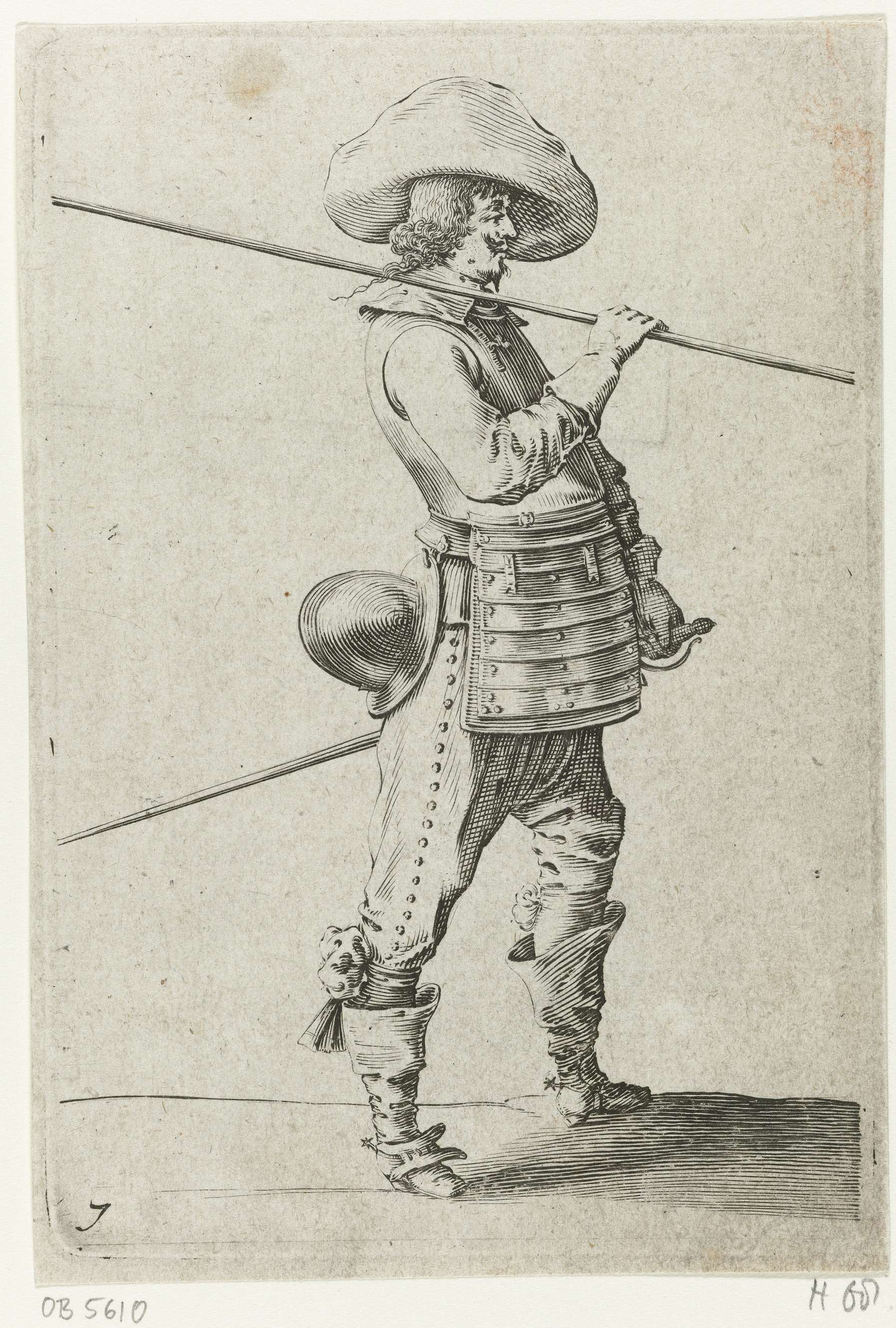 Staande soldaat met borstkuras en speer over de scho...