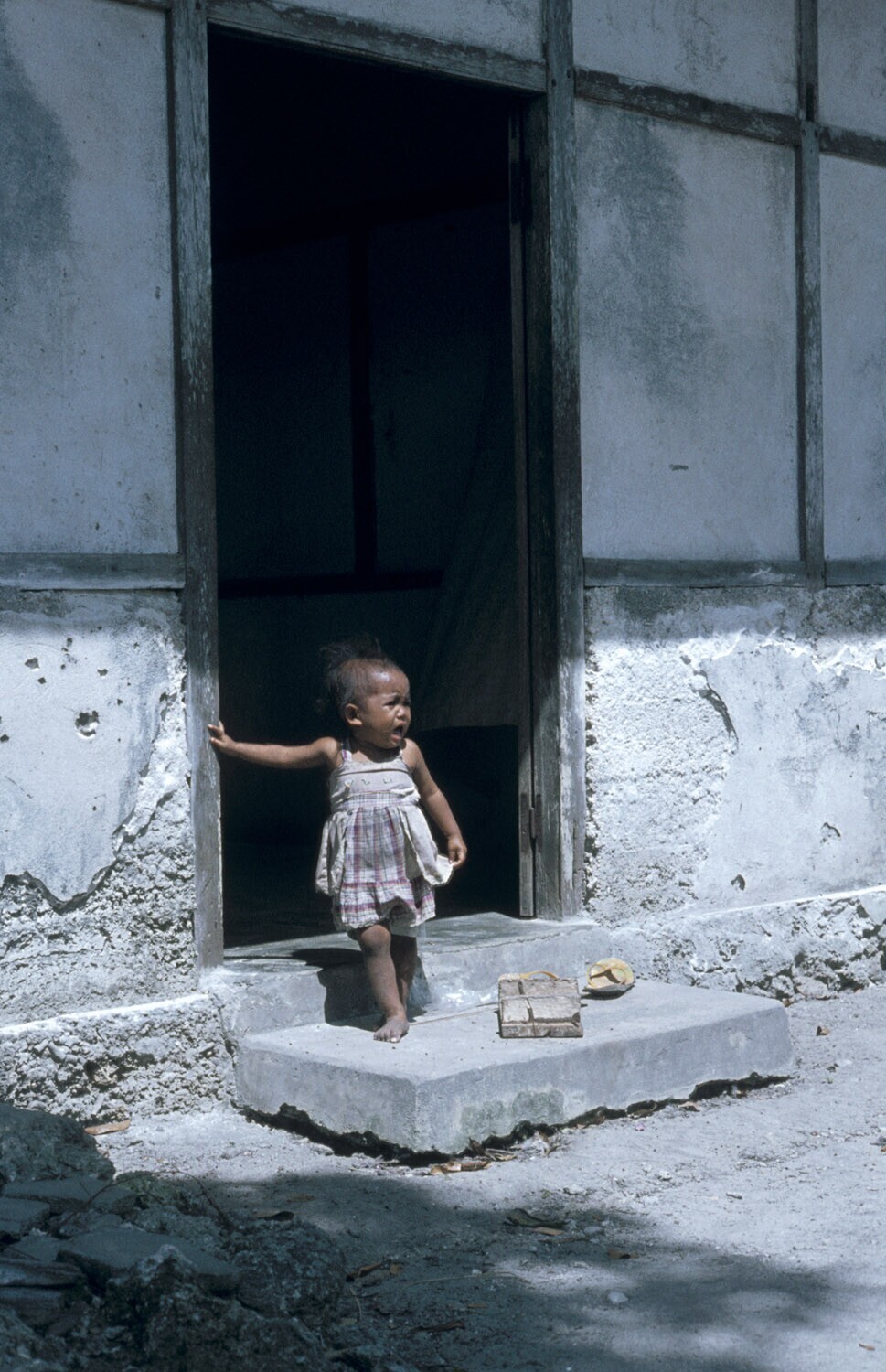 Een klein meisje in de deuropening van een huis in N...
