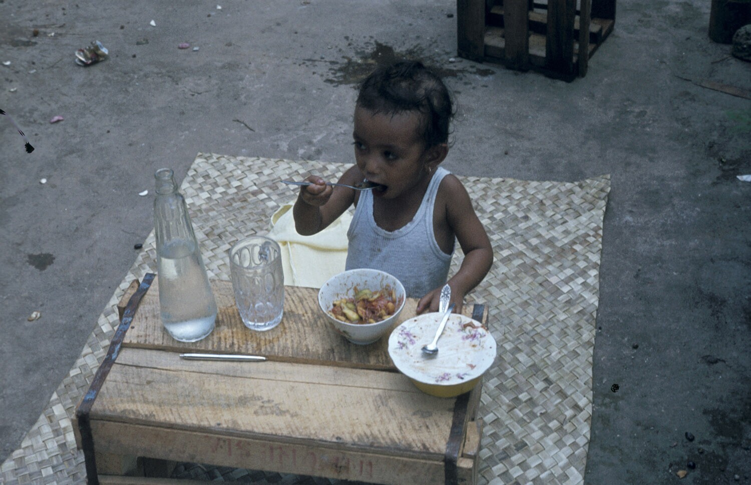 'Klein kind eet ''rujak'', Tual op Kei, Molukken.'