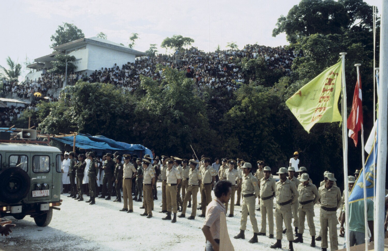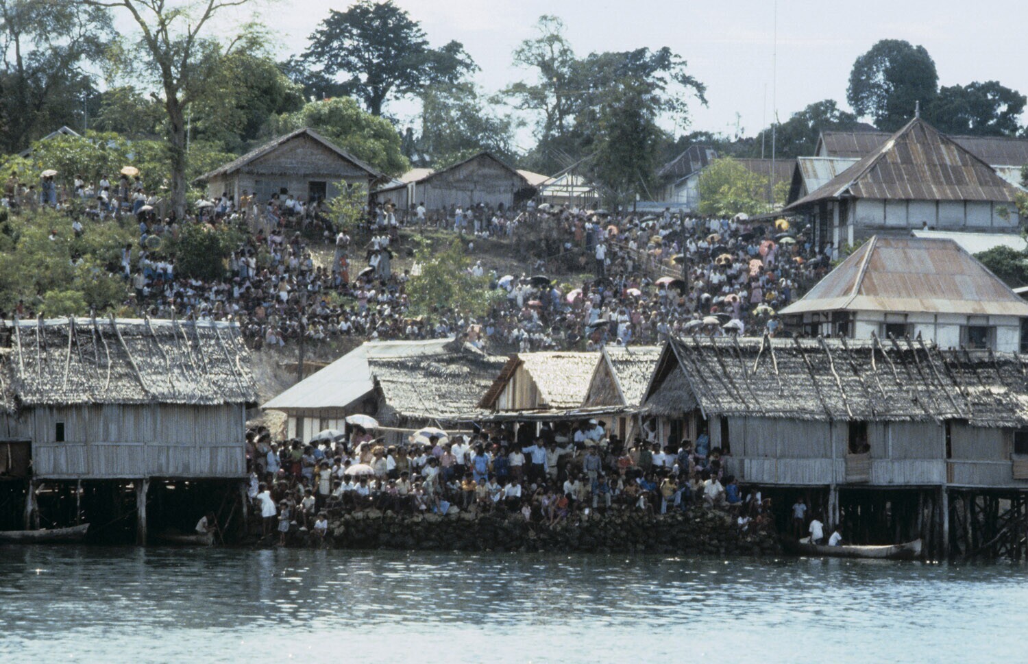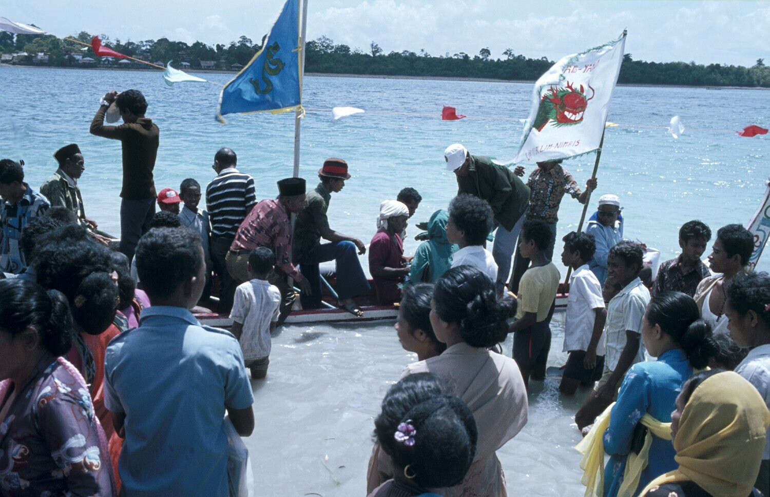 'Toeschouwers van de ''Belang Prauw'', een grote roe...
