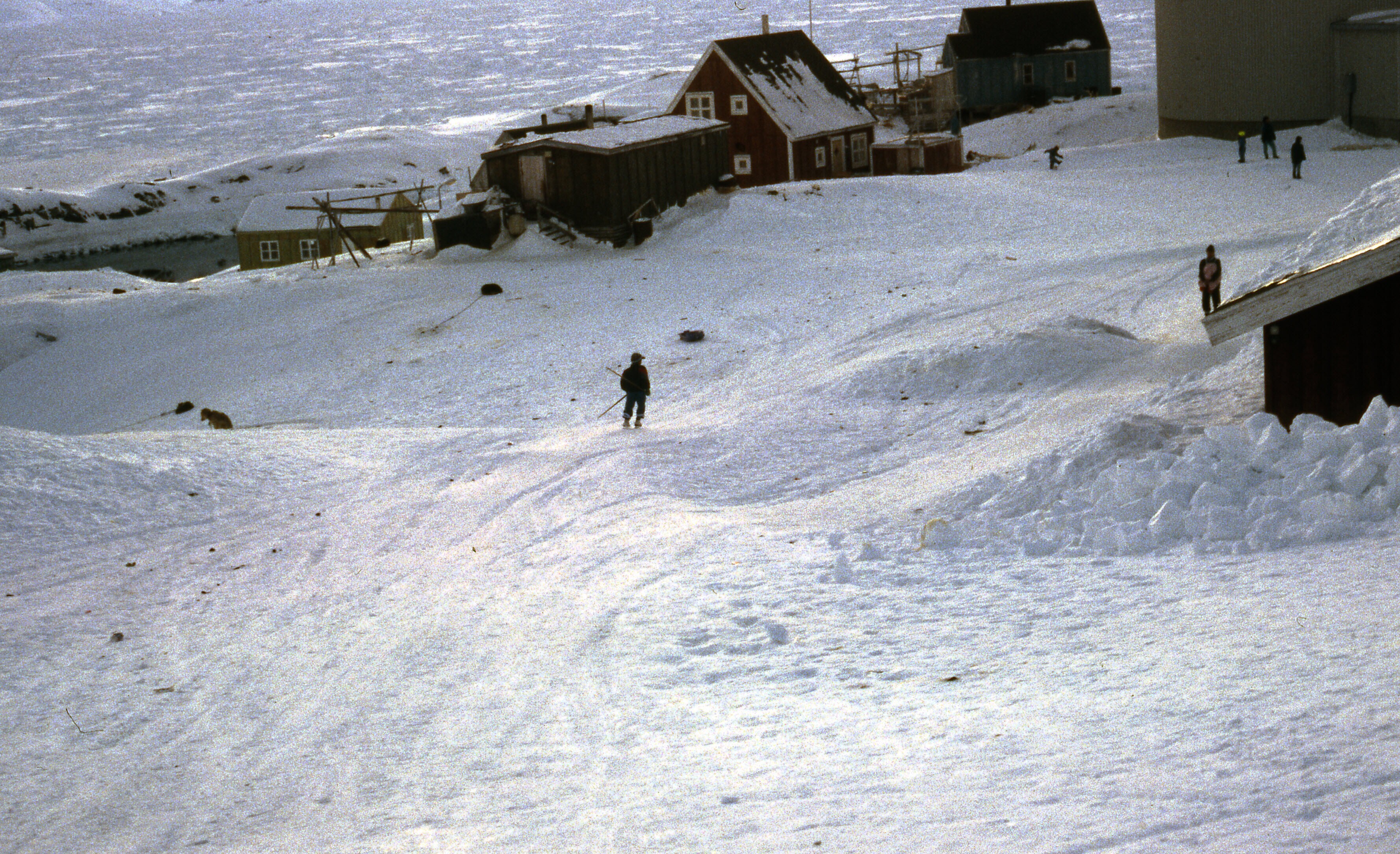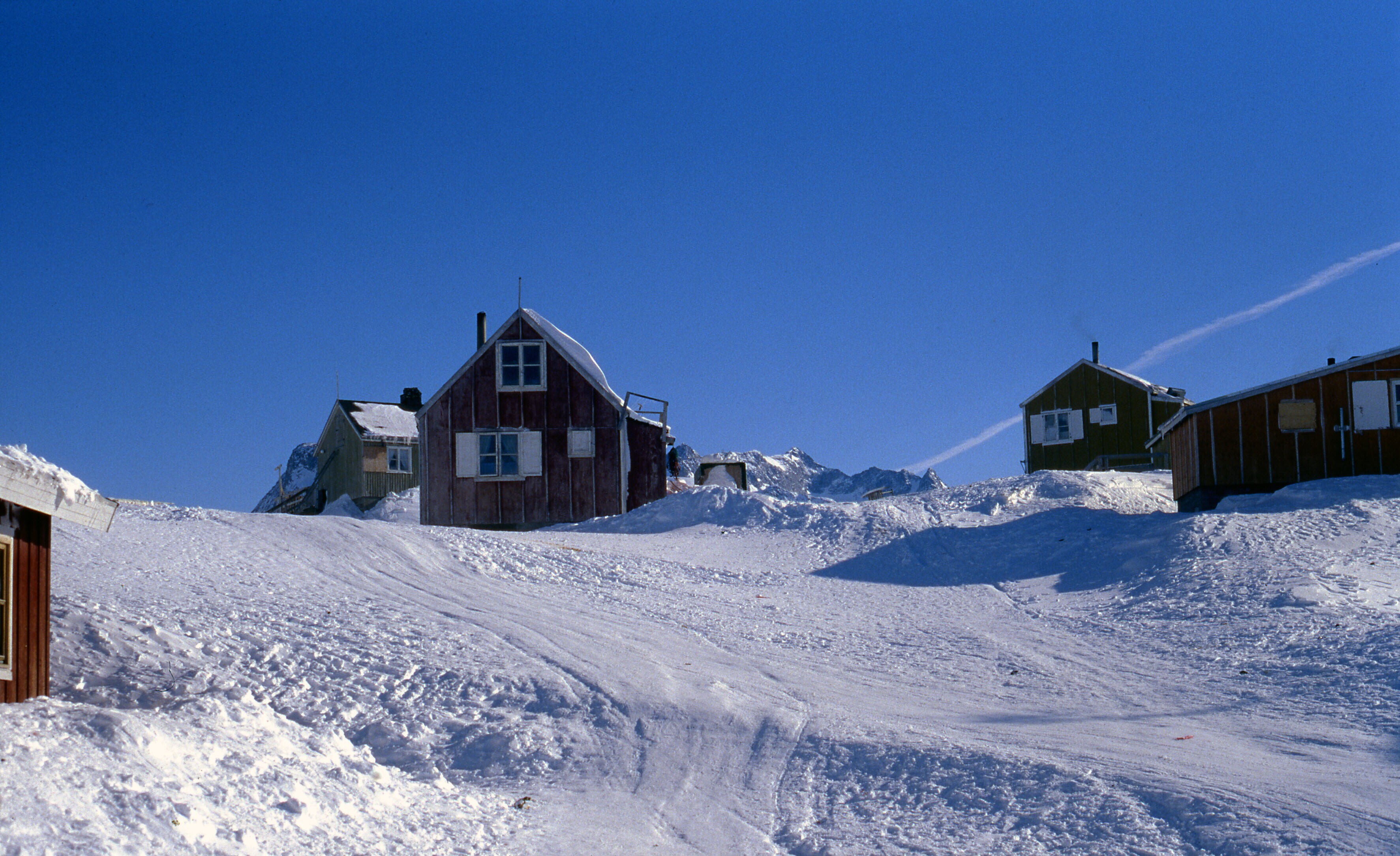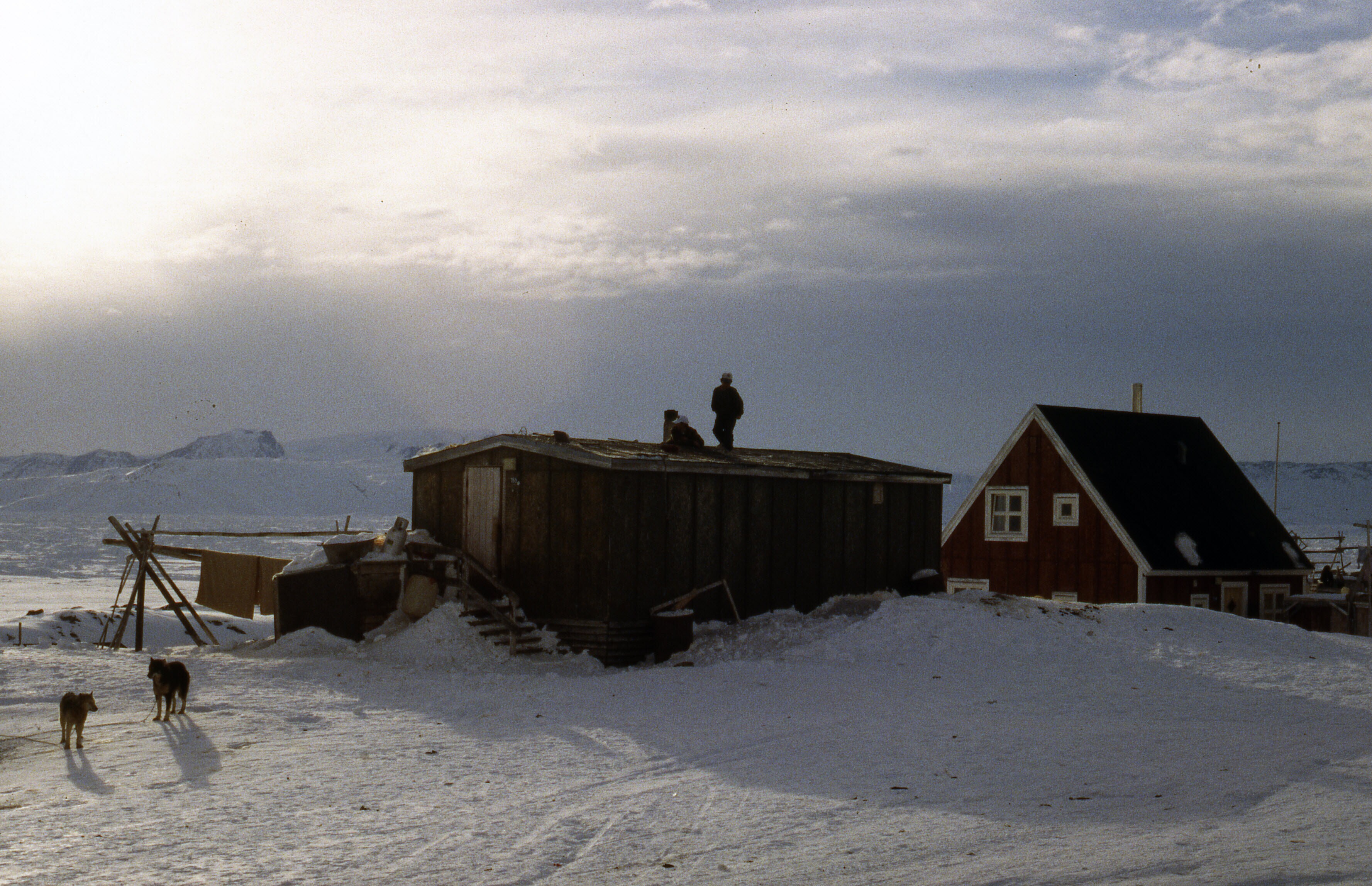 - Besneeuwde huizen op een lichte helling in Tiniteq...