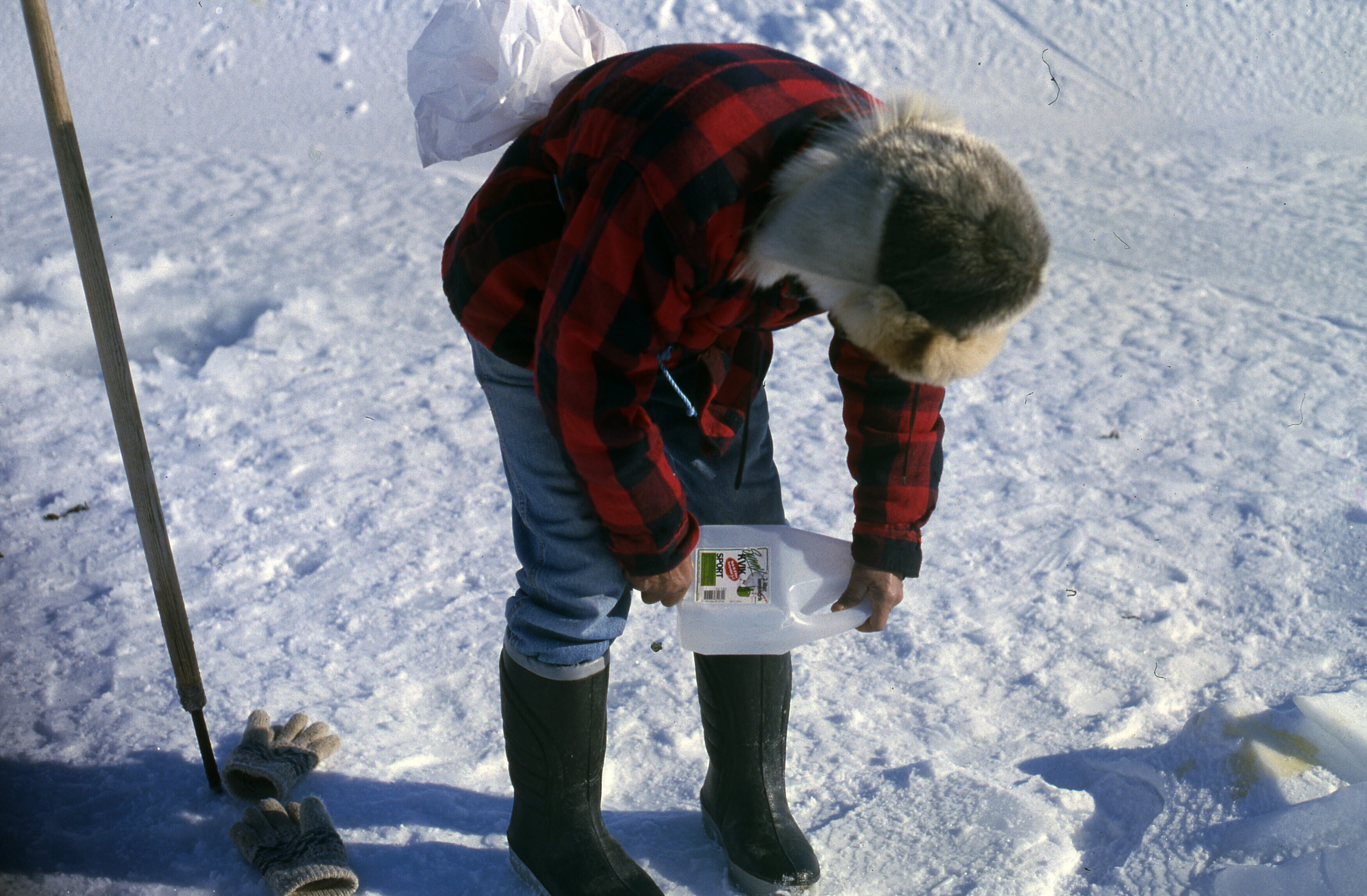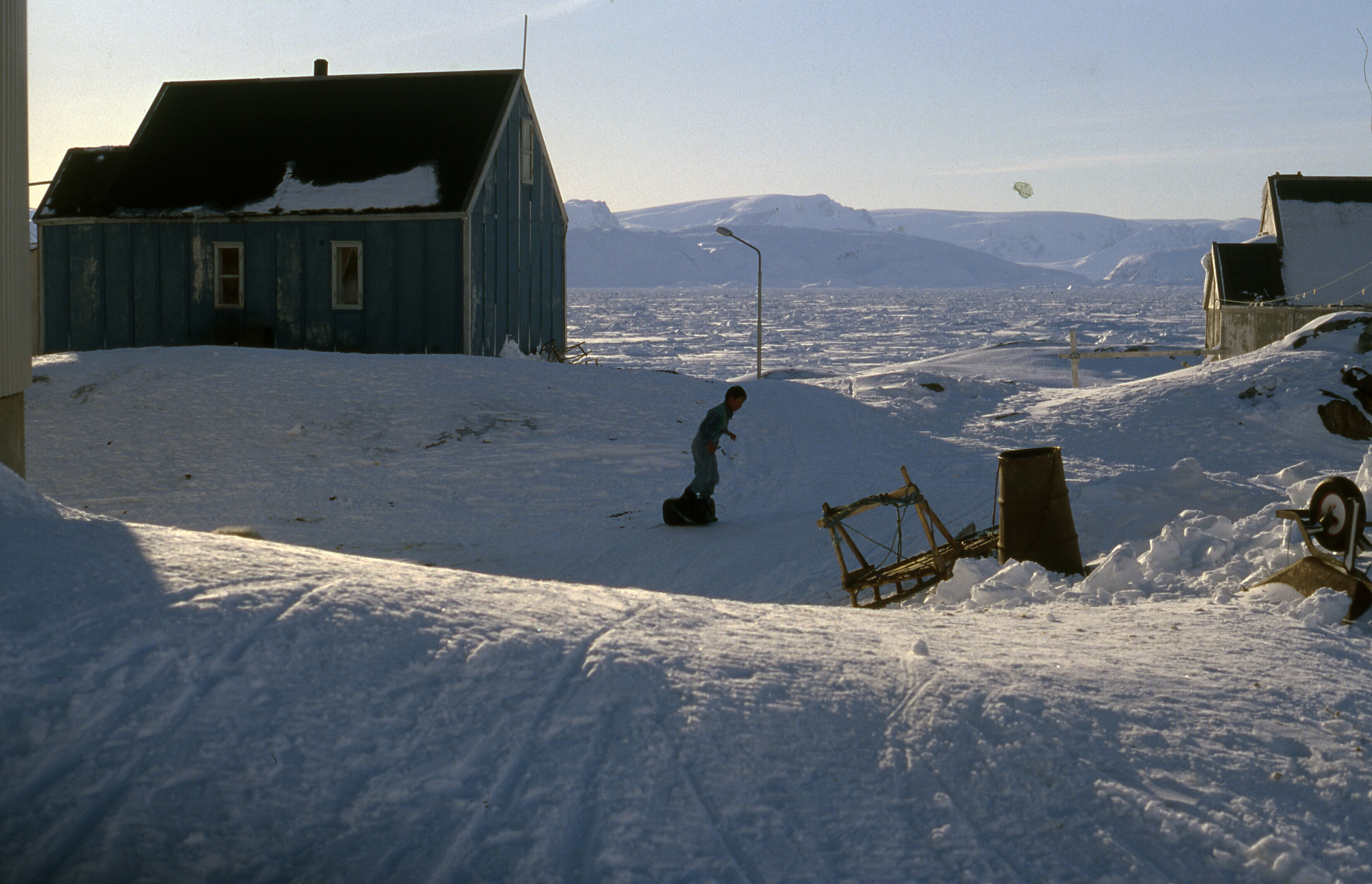 - Besneeuwd Tiniteqilaaq. Een jongen sleept een jari...