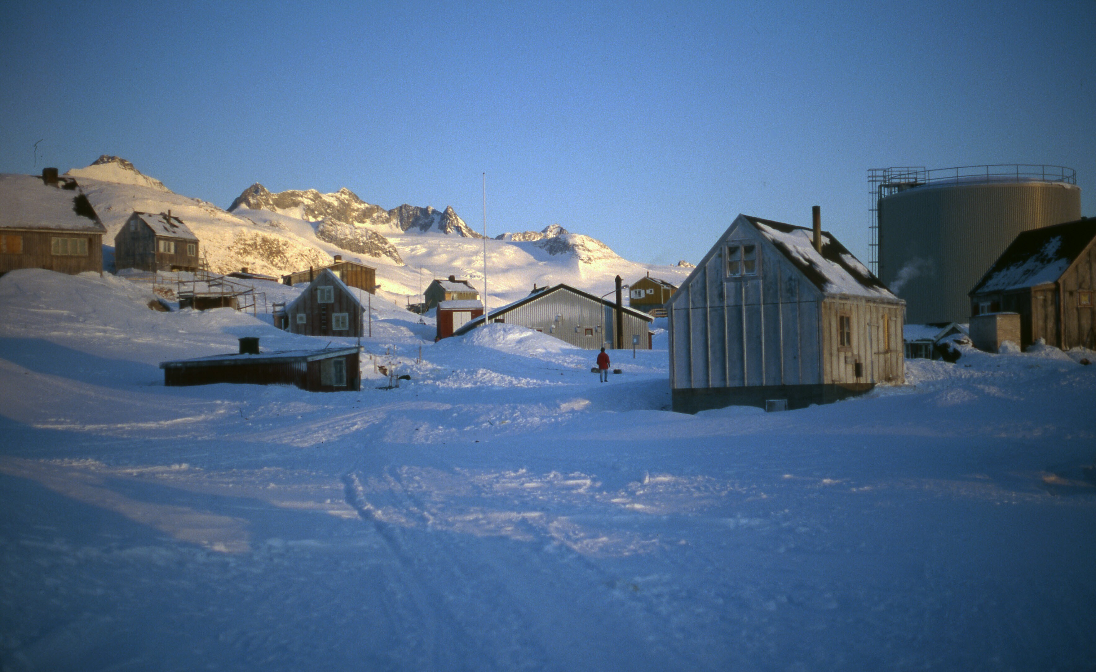 - Besneeuwde huizen en watertank van Tiniteqilaaq, m...