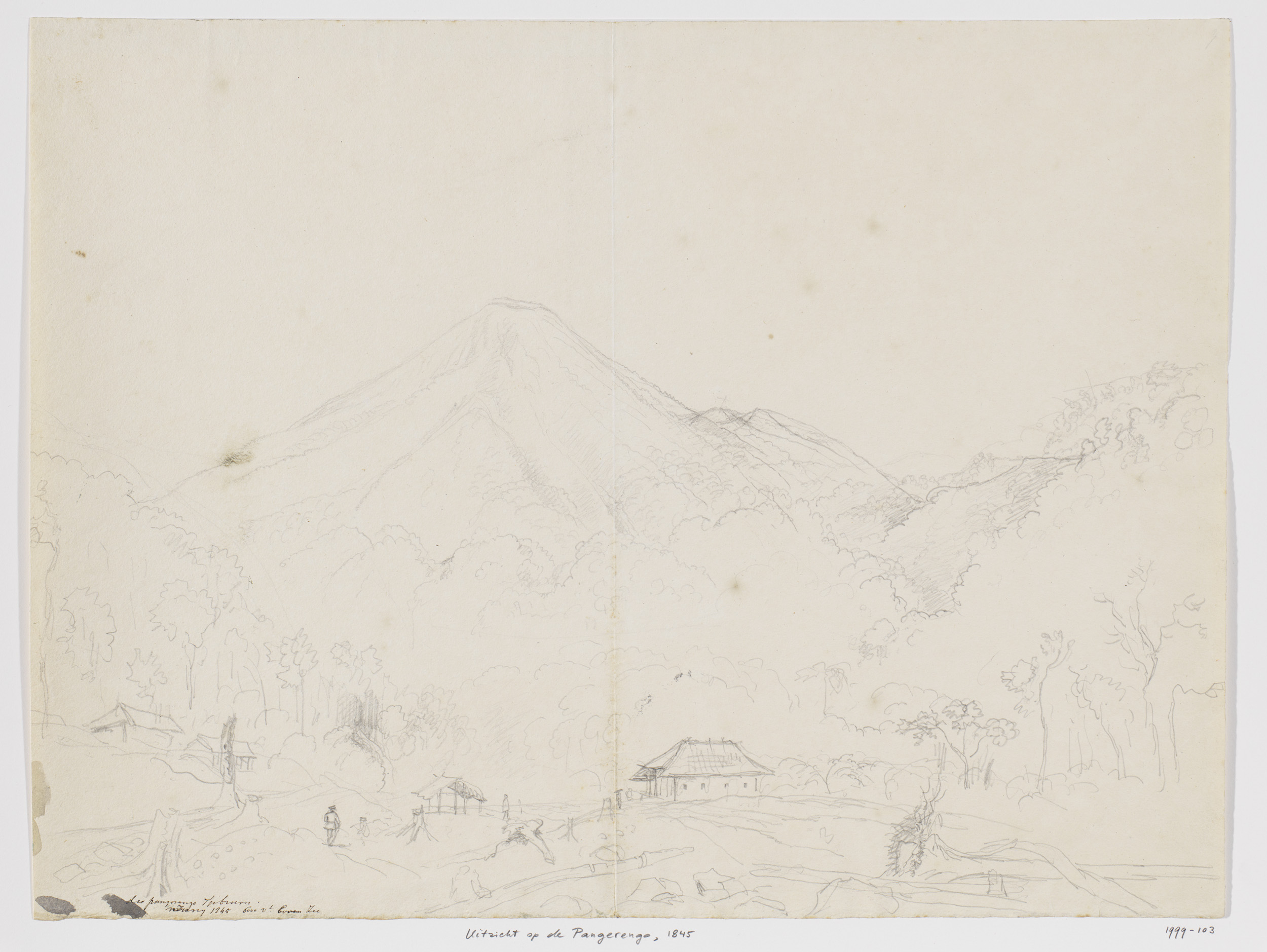 Gezicht op een rokende vulkaan en woonhuis, arekapal...
